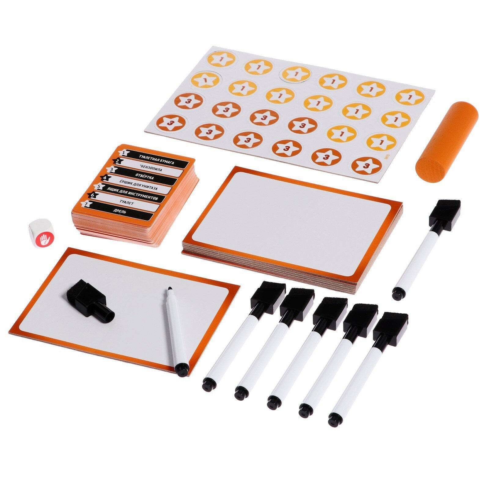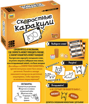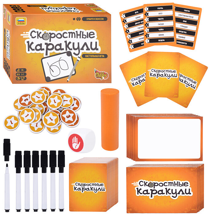 | Комплектация | планшеты для рисования – 7 шт. карточки со словами – 70 шт. жетоны очков – 24 шт. специальный кубик маркеры – 7 шт. правила игры фишка |