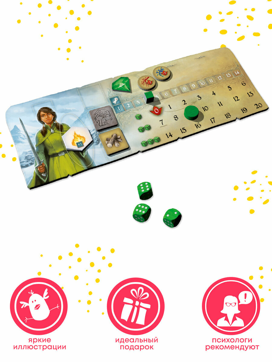 Комплектация | Двустороннее игровое поле, Карточки героев – 4 шт, Игровые карточки – 72 шт, Картонные элементы – 130 шт, Кубики – 16 шт, Деревянные жетоны – 16 шт, Фишка рассказчика, Правила вводной игры, Памятка |