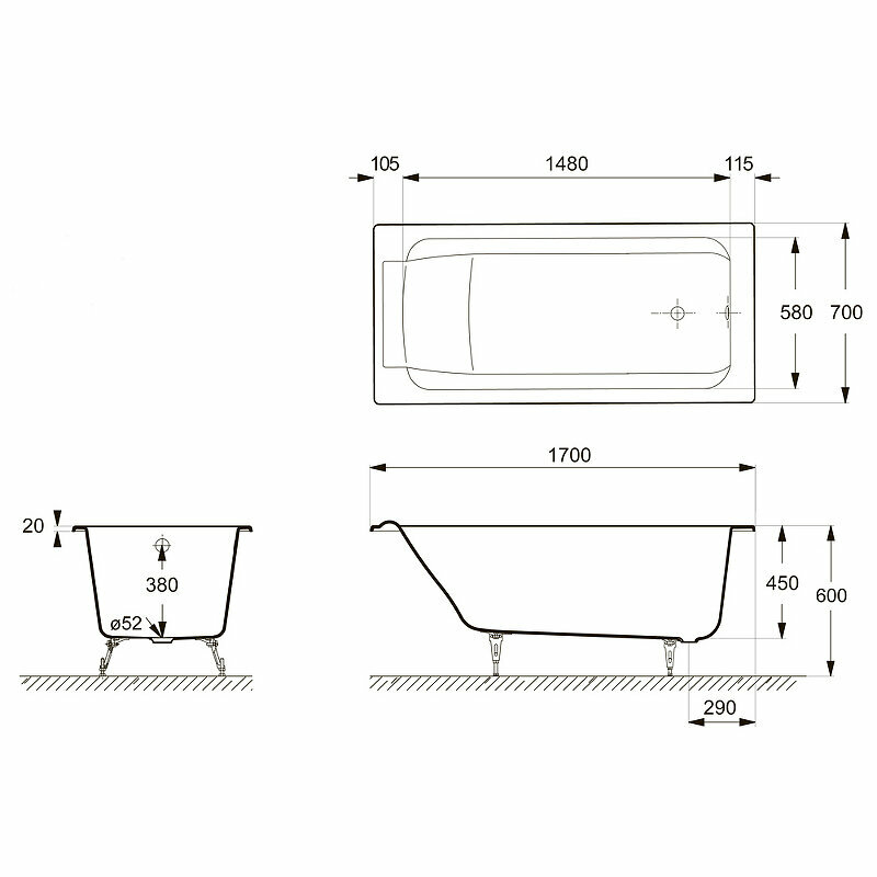 - Размер чаши ванны (ШхВхД): 700х450х1700 мм.