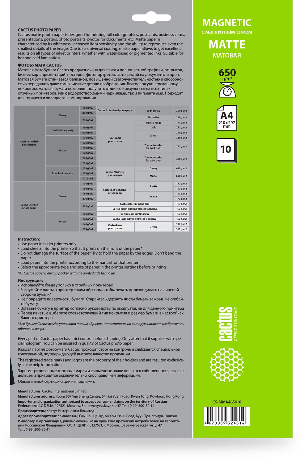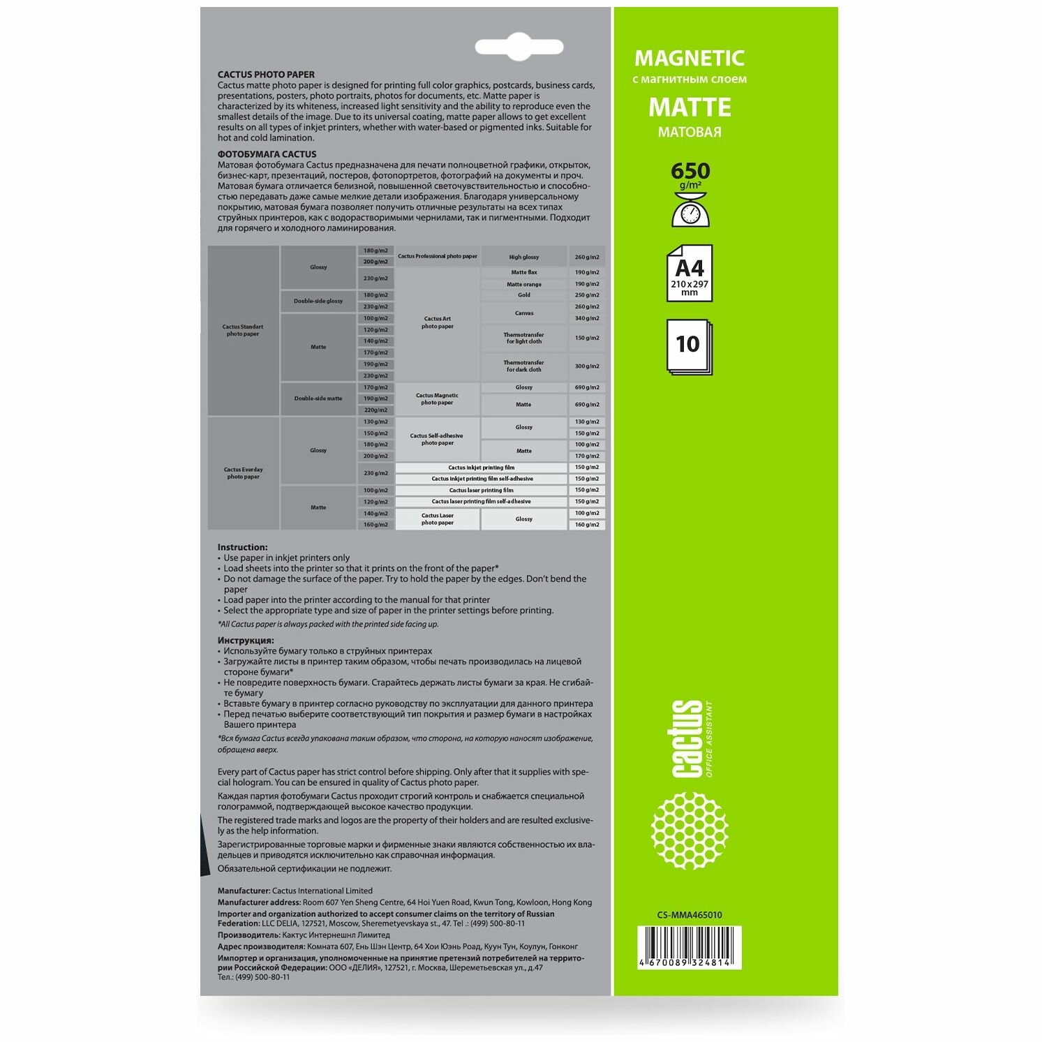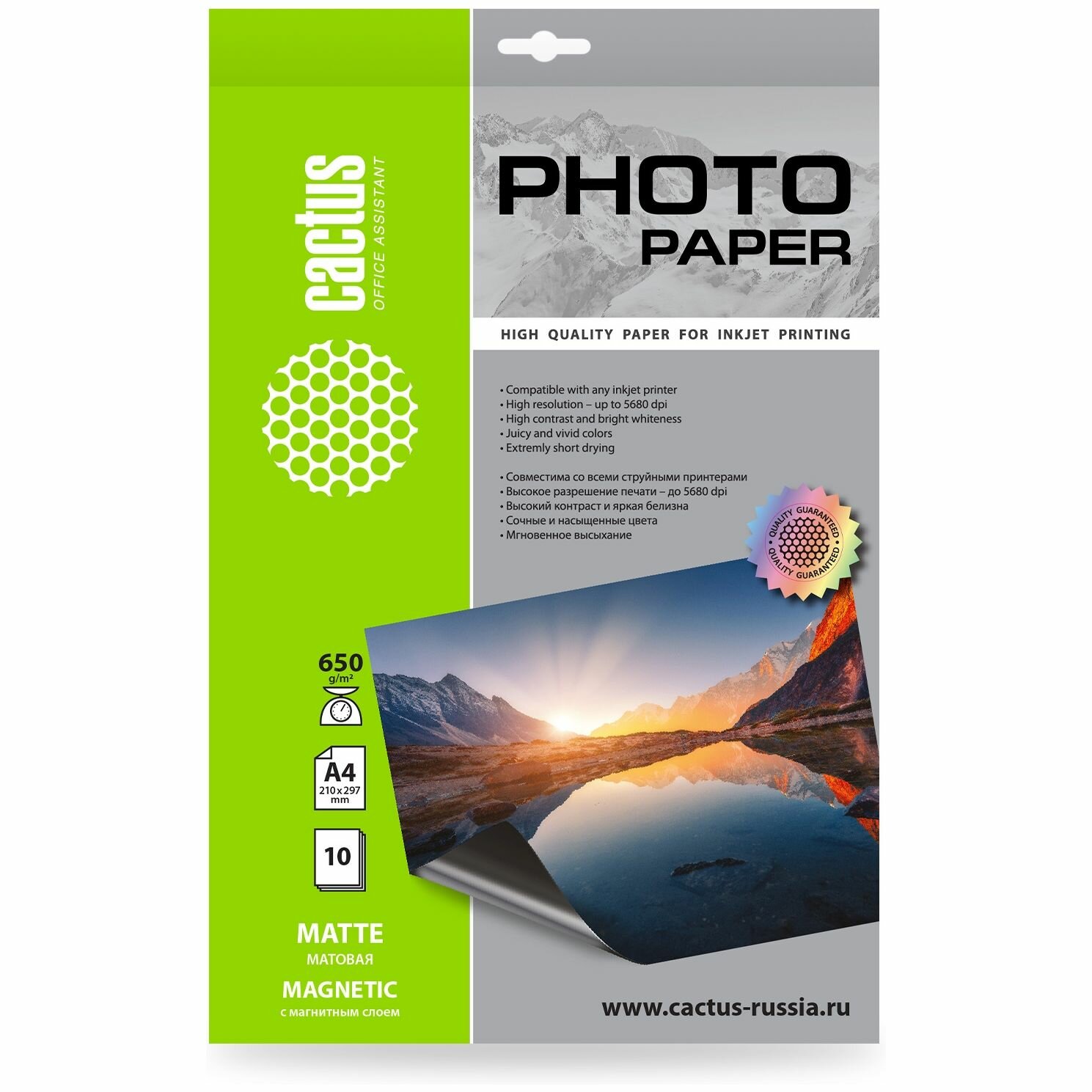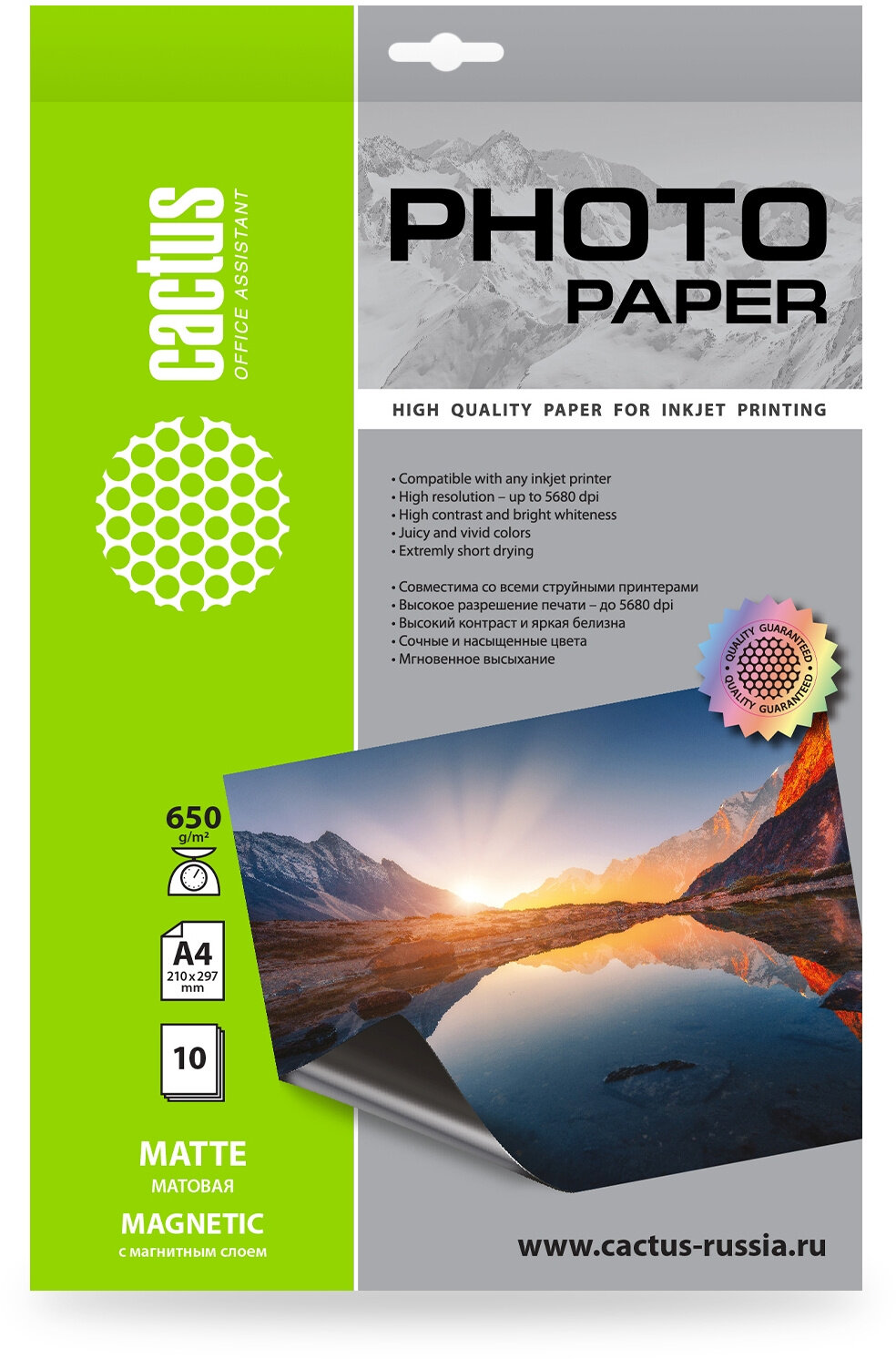 Фотобумага Cactus CS-MMA465010 формат A4, плотность 650г/м2, 10 листов, покрытие матовое/магнитный слой, для струйной печати, белый