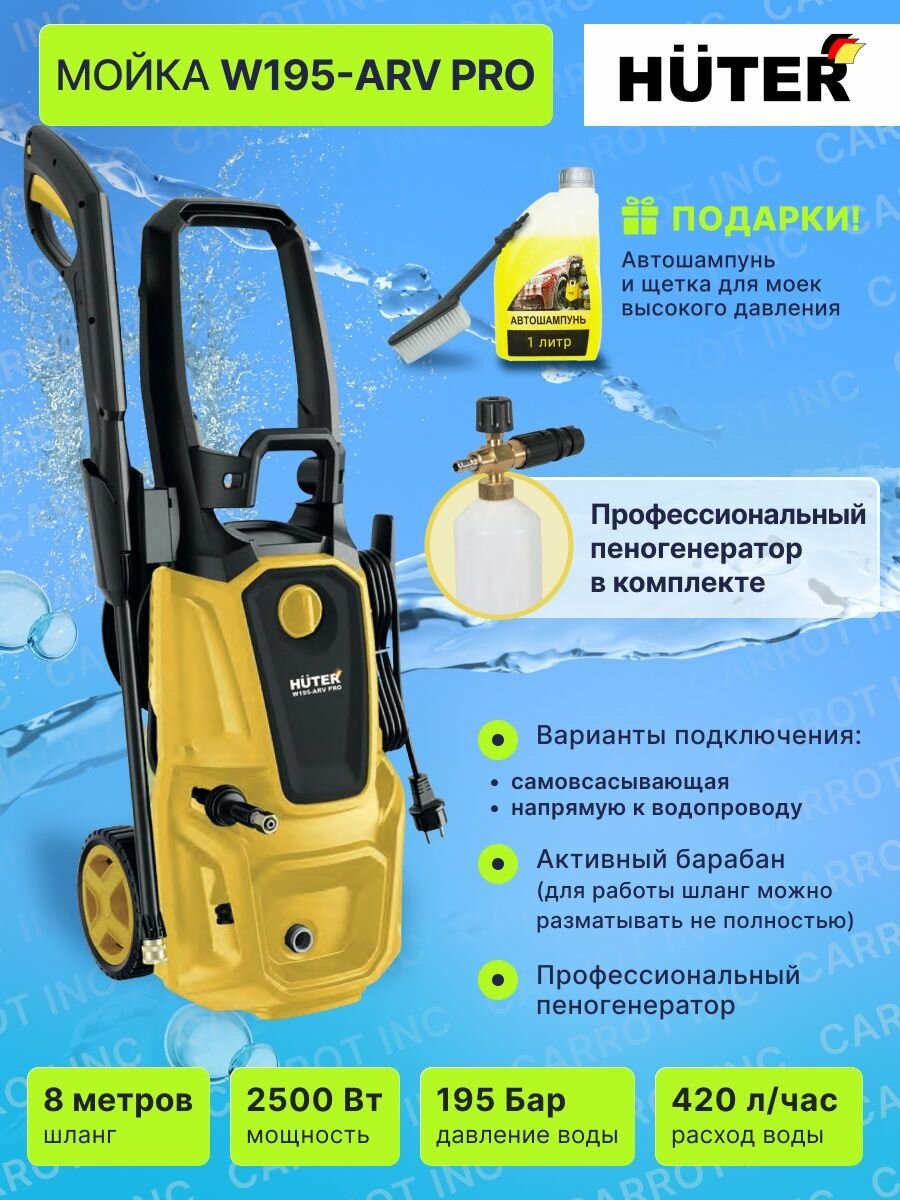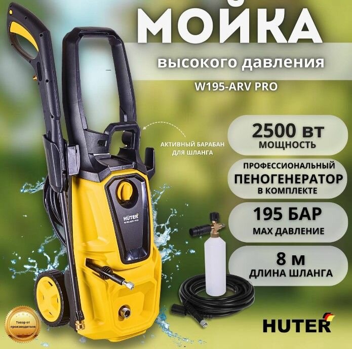 Минимойка Huter W195-ARV Pro, мощность 2500Вт, максимальное давление 195Бар, длина шланга 8м (70/8/53)
