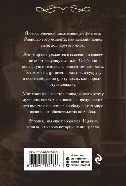 Я была обычной писательницей фэнтези. Ровно до того момента, как дедлайн не довел меня до… другого мира. Этот мир не нуждается в спасении и совсем не ждет девушку с Земли. Особенно попавшую в тело жены одного темного мага. Тот холоден, циничен и жесток, а супругу и вовсе выбрал по цвету волос, как породистую лошадку. Мне совсем не хочется принадлежать этому мужчине, вот только никто не предупредил, что вместе с правом на свободу в этом мире возникают обязательства по любви. Впрочем, мы еще поборемся. Я давно решила, что свою историю напишу сама! 1. Переиздание в карманном формате покета! 2. Увлекательная и очень смешная история от топового тандема соавторов! 3. Книга, от которой вы будете смеяться не прекращая! 4. Прекрасная любовная линия и огненная химия!