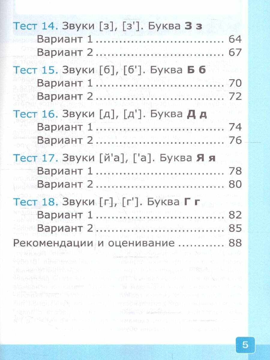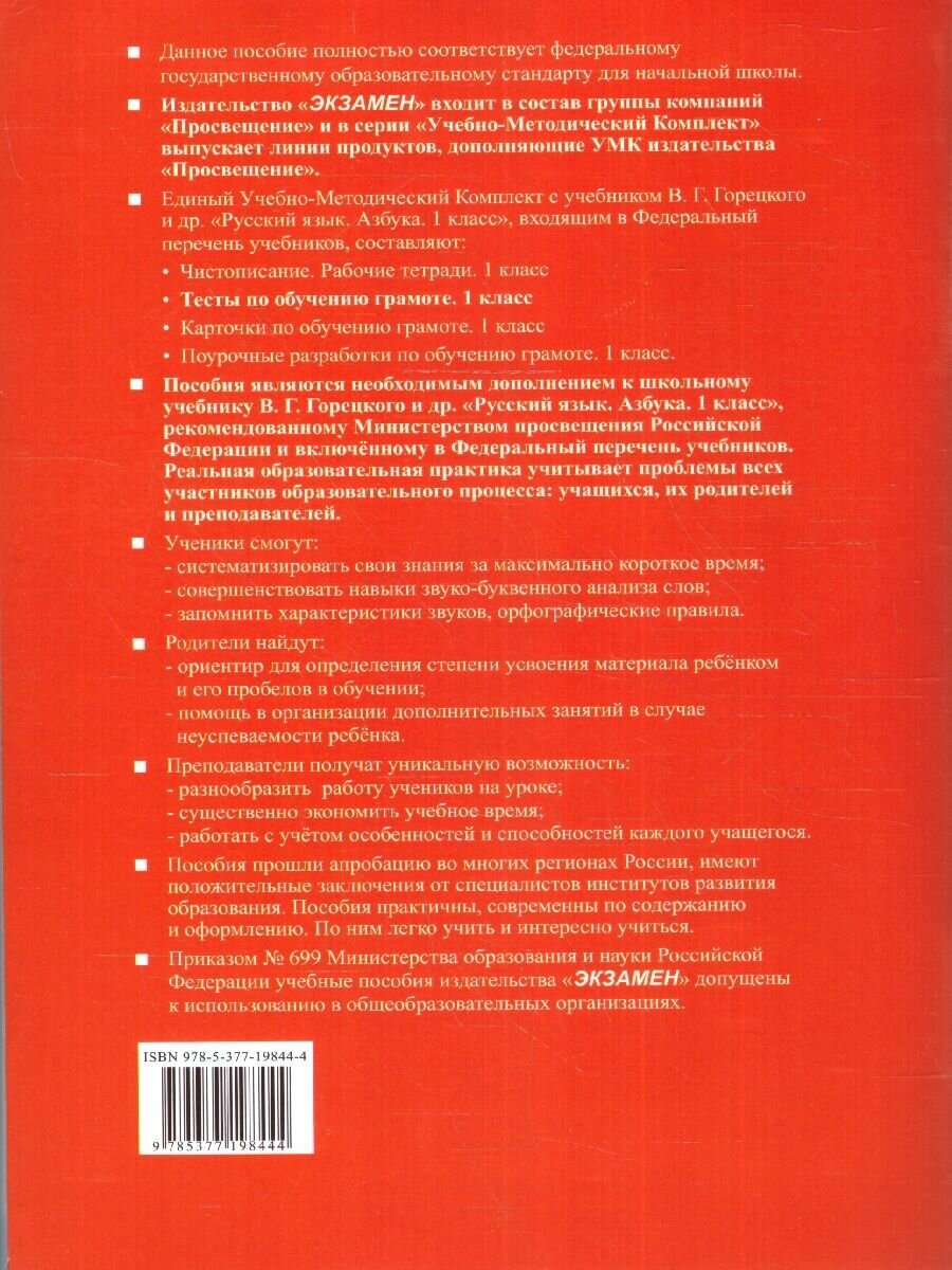 Данное пособие полностью соответствует федеральному государственному образовательному стандарту (второго поколения) для начальной школы. Тесты по обучению грамоте помогут учащимся в изучении и систематизации учебного материала за максимально короткое время. Они способствуют не только быстрой проверке знаний, но и более глубокому усвоению программы, тренируют ученика по разным направлениям грамматических умений, совершенствуют навыки звуко-буквенного анализа слов, расширяют словарный запас, помогут запомнить характеристику звуков, орфографические правила, изучаемые в первом классе, развивают устную и письменную речь, воображение ребенка. Тесты могут использоваться при прохождении материала по любой программе.