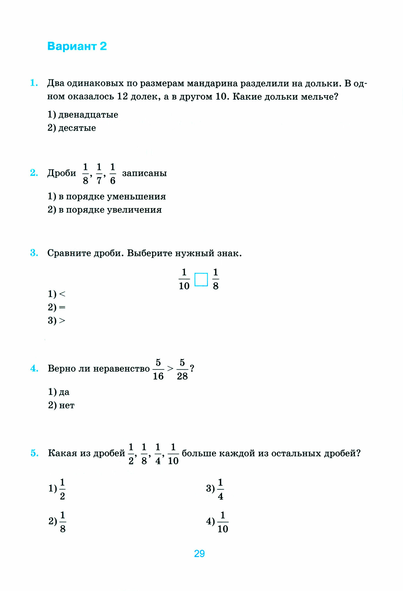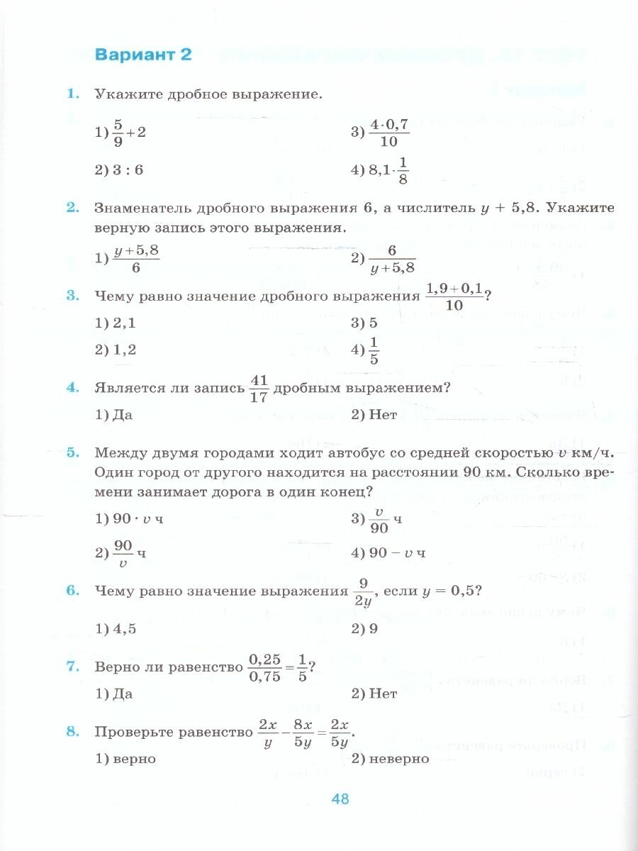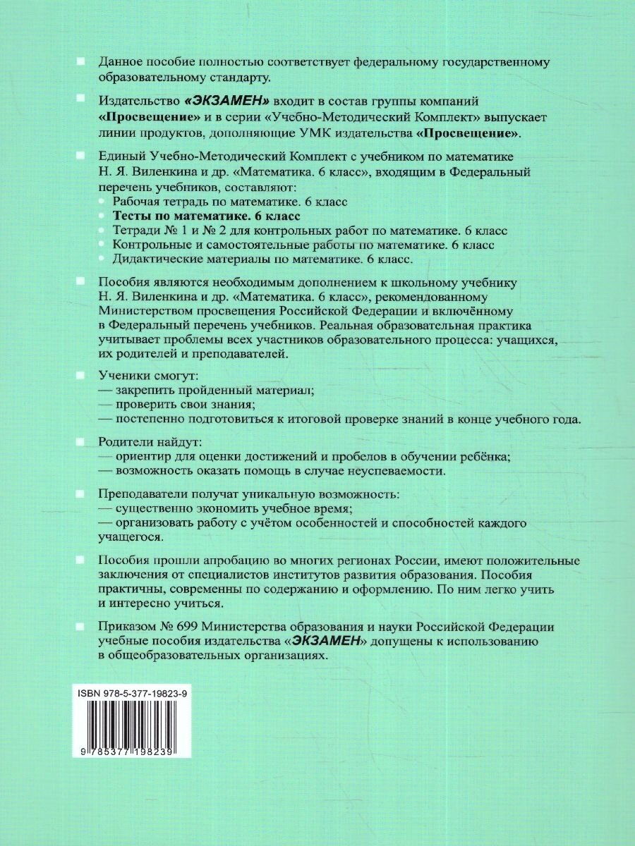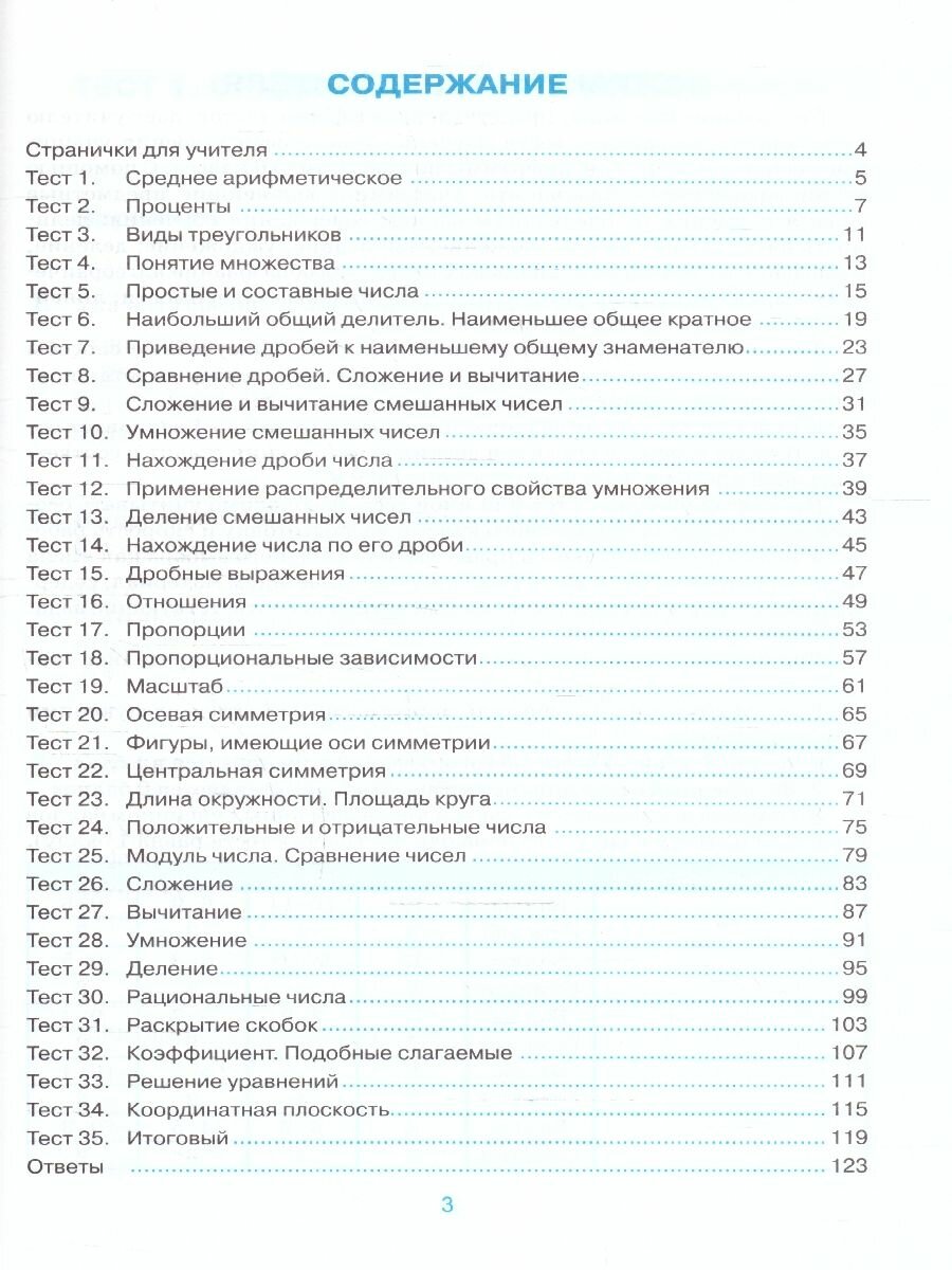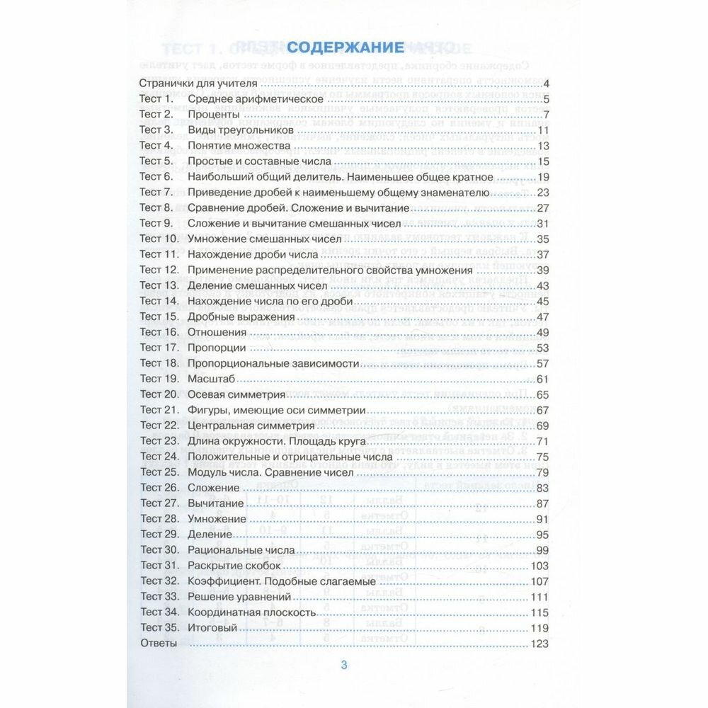 Данное пособие полностью соответствует федеральному государственному образовательному стандарту. На выполнение теста выделяется от 15 до 25 минут времени урока.Для учителя даются методические рекомендации по подсчёту баллов и выставлению отметок. В конце пособия приведены ответы ко всем заданиям тестов. Сборник также может быть использован учащимися 6 класса для самостоятельной работы.