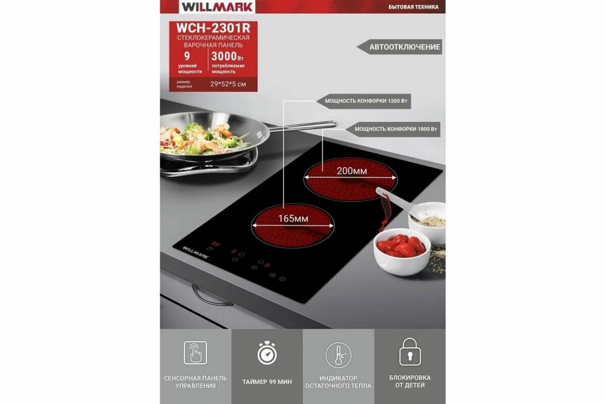 Стеклокерамическая варочная поверхность WILLMARK - это современный и надежный прибор, сочетающий в себе преимущества стекла и керамики. Благодаря своей конструкции, эта поверхность обеспечивает быстрое и равномерное распределение тепла, что позволяет экономить время и энергию.Поверхность WILLMARK имеет ширину 29 см, что позволяет разместить на ней несколько кастрюль и сковородок одновременно. При этом блокировка поверхности и автоотключение защищают пользователя от случайных травм и перегрева, что делает работу с поверхностью максимально безопасной.Кроме того, варочная поверхность WILLMARK оснащена таймером и 9 уровнями мощности, что позволяет выбрать оптимальный режим приготовления любого блюда. Благодаря этому, приготовление еды становится проще и быстрее.В комплекте с варочной поверхностью WILLMARK поставляются инструкция по эксплуатации и гарантийный талон. Гарантийный срок на этот товар составляет 1 год.В общем, стеклокерамическая варочная поверхность WILLMARK - это идеальное решение для тех, кто хочет получить быстрый, простой и безопасный способ приготовления пищи. Сделайте свою жизнь еще проще и комфортнее с помощью этого надежного и удобного прибора!