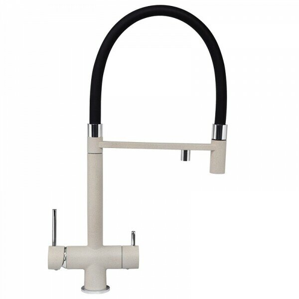 Смеситель с душем и подключением фильтрованной воды. Одноизливный& фильтрованная и водопроводная вода подаются через один аэратор. Это позволяет не нарушая общего вида смесителя, получать очищенную и водопроводную воду через одно устройство. Гибкий излив смесителя выполнен из армированного ПВХ и имеет длину 100 см. Корпус смесителя выполнен из латуни.