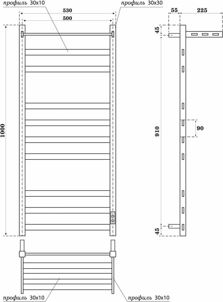В комплект поставки входит: Полотенцесушитель - 1 шт, кронштейны для крепления к стене - 3 шт, сетевой кабель - 1 шт, комплект скрытого подключения - 1 шт, паспорт/гарантийный талон - 1 шт