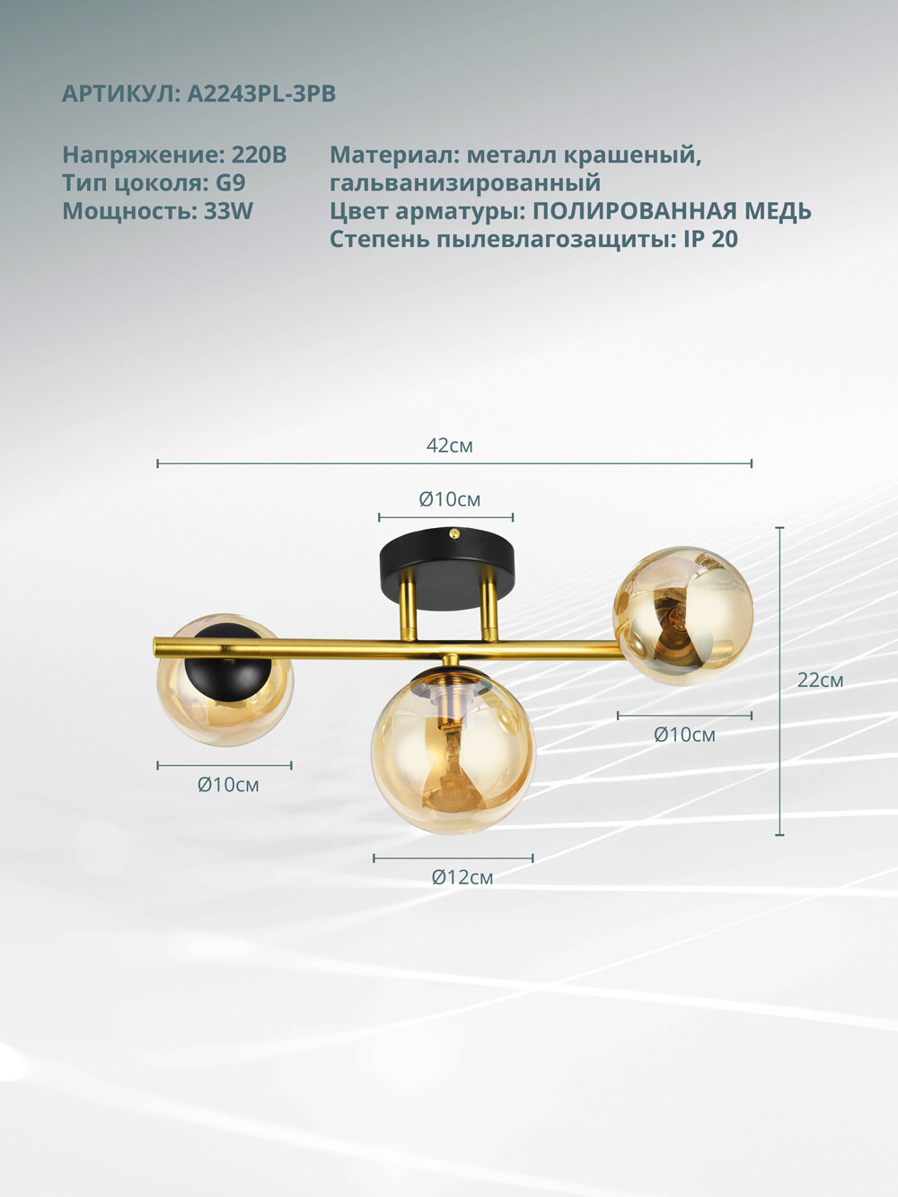 Подвесная люстра Arte Lamp Gemini A2243SP-9PB - идеальное решение для создания стильной и комфортной атмосферы в вашей гостиной. Эта модель имеет 9 галогеновых ламп с цоколем G9, обеспечивая уютное освещение на площади до 19 квадратных метров. Общая мощность составляет 297 Вт, гарантируя достаточную яркость для вашего пространства.Плафоны в форме шара из стекла имеют янтарный цвет, который создает приятную, нежную атмосферу. Арматура выполнена из прочного металла в цвете меди, что придает люстре элегантный и современный вид. Направление плафонов в стороны дает возможность равномерно осветить всю комнату.Данная модель из коллекции Gemini легко устанавливается на потолок с помощью монтажной пластины, а также подходит для натяжных потолков. Стильный и современный дизайн этой люстры позволяет ей гармонично вписаться в любой интерьер. Выгодой данного товара является его производитель Arte Lamp, который предоставляет гарантию на товар в течение 12 месяцев. Вы можете быть уверены в качестве и надежности этой люстры на долгое время. Создайте уют и элегантность в вашей гостиной с подвесной люстрой Arte Lamp Gemini A2243SP-9PB.