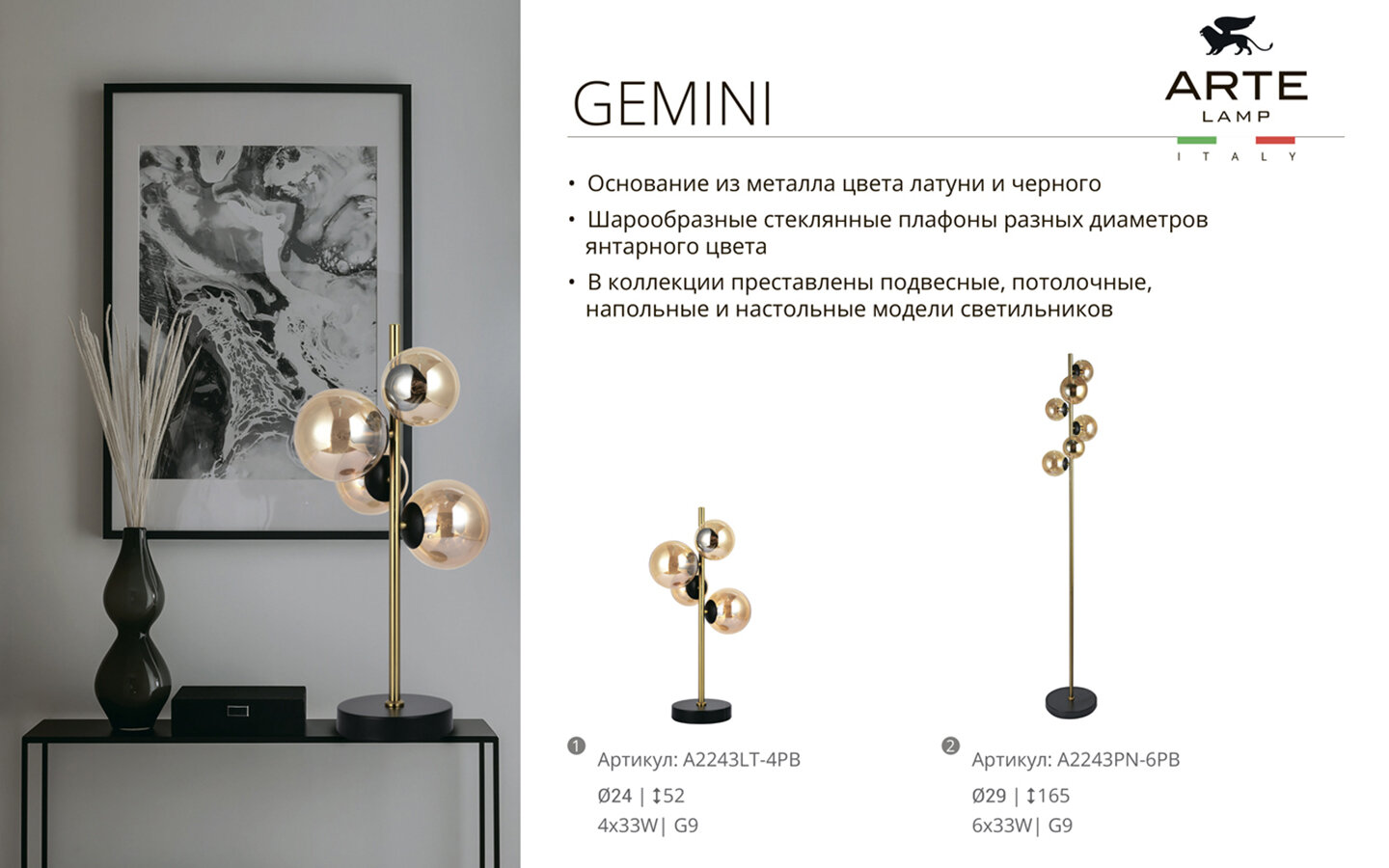Торшер A2243PN-6PB серии GEMINI в стиле хай-тек. Подчеркнет стиль помещения. Высота 1.7 m. Диаметр 0.3 m Параметры пылевлагозащиты IP — 20. Форма декоративная. Плафон стеклянный цвета янтаря, а материал/цвет арматуры металл/медный. Использует лампу с цоколем G9. Площадь освещения охватывает 13 m?. Идеально подходит для гостиной или кафе и ресторанов. Страна происхождения бренда — Италия.