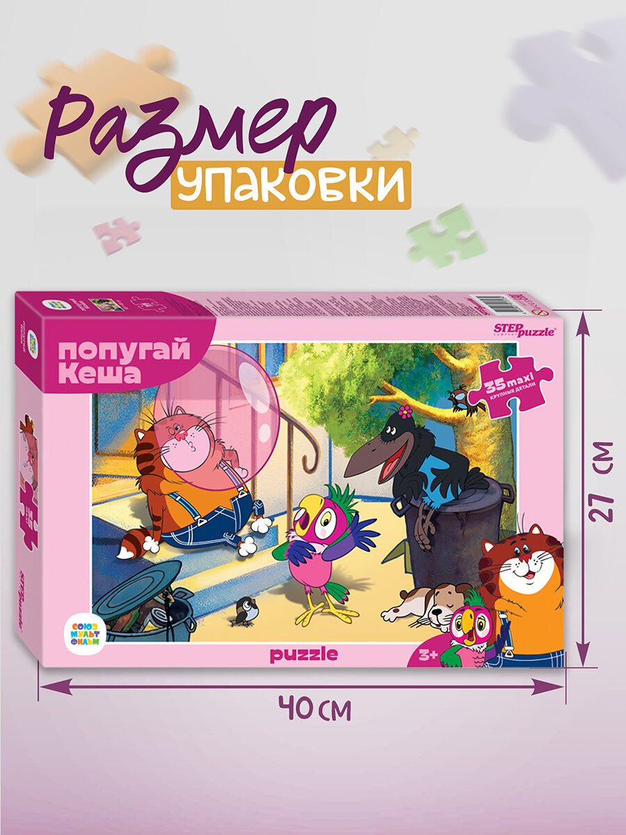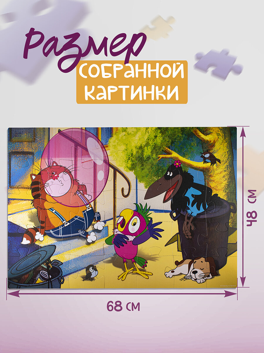Пазл «Попугай Кеша» состоит из 35 крупных деталей. Его картинка яркая и забавная: Кеша тут поёт, а кот надувает огромный пузырь из жвачки.