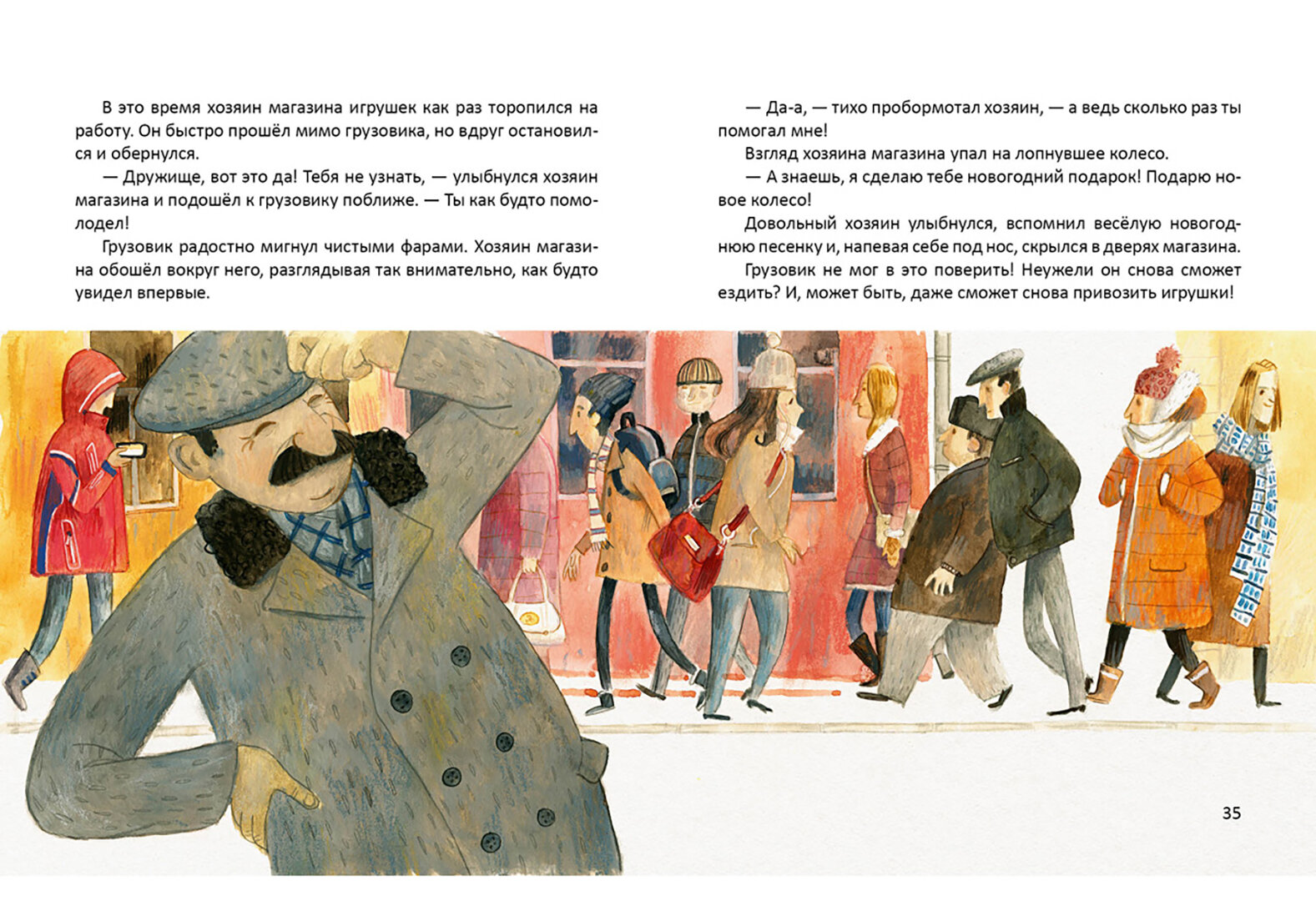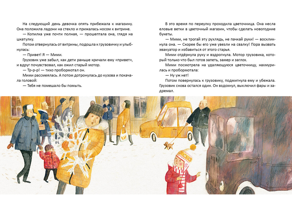 Маленький красный грузовик привозил в город игрушки и всегда радовал детей своим появлением. Но однажды зимой хозяин магазина сказал, что теперь игрушки будет возить новый грузовик, большой и мощный, — а старый грузовик стал слишком медлительным, так что пусть себе стоит в переулке и отдыхает. Маленький красный грузовик простоял там целый год и так зарос пылью и грязью, что и не узнать. Он уж было совсем загрустил, но за несколько дней до Нового года неожиданно познакомился с девочкой по имени Мими. И что тут началось! Неужели красный грузовик снова сможет ездить и радовать ребят?..