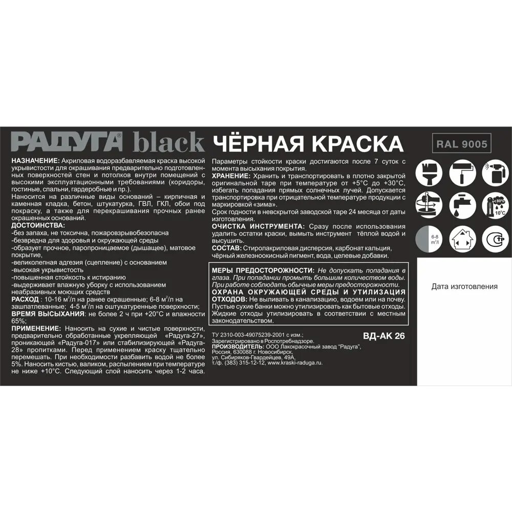 **Краска для стен и потолков Радуга ВД-АК 26** — акриловый водоразбавляемый состав с высокой укрывистой способностью Предназначен для нанесения на предварительно подготовленные поверхности стен и потолков внутри помещений, которые характеризуются высокими эксплуатационными требованиями. К ним относятся коридоры, гардеробные, спальни, гостиные и другие. Краску такого типа можно наносить на поверхности из кирпичной или каменной кладки, бетона, штукатурки, обоев под покраску, ГВЛ, ГКЛ. Матовое покрытие, формируемое ею, обладает отличной паропроницаемостью. Также оно способно выдерживать влажную уборку с применением неабразивных моющих составов. Продукцию следует наносить на сухое и чистое основание — для этого можно воспользоваться кистью, валиком или распылителем. Перед этим ее нужно тщательно перемешать. Последующий слой необходимо наносить спустя 1-2 часа.