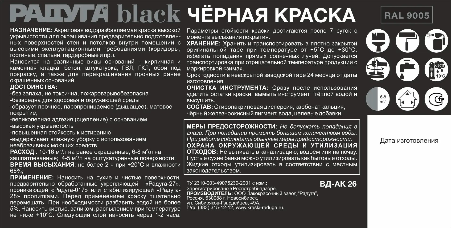 Краска для стен и потолков Радуга ВД-АК 26 цвет черный 0.9 л