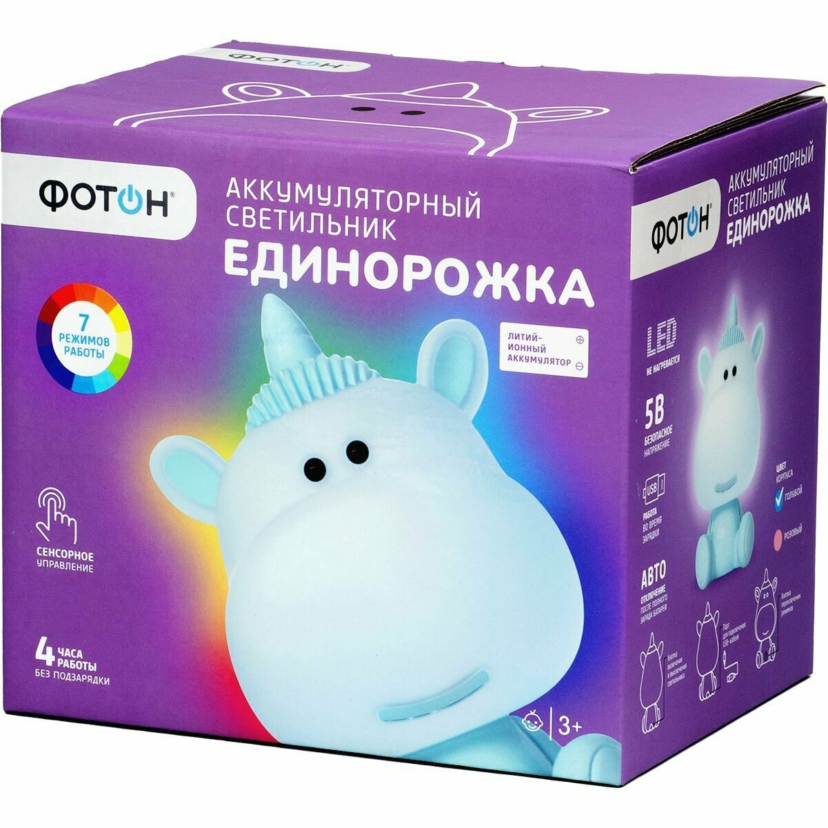 Настольный ночник в виде милого единорога станет верным другом для Вашего ребенка во время сна. Детский ночник крайне прост в использовании, и абсолютно безопасен, так как имеет минимальный уровень нагрева встроенных светодиодов. Разнообразие цветовых режимов светильника и красочное оформление никого не оставят равнодушным и обязательно привлекут детское внимание. Всего доступно 7 режимов работы светильника ночника. Белый дневной свет 4000К доступен в 2 вариантах яркости. А также RGB свечение: красный, зеленый, голубой и режим попеременной смены цветов «мультицвет», который включает в себя 7 цветов радуги. Аккумуляторный светильник оснащен механической кнопкой включения и выключения на обороте ночника, а также сенсорной кнопкой для переключения режимов на животике Единорожки. Ночник детский для сна заряжается от USB через любой гаджет (провод в комплекте). Питание от аккумулятора исключает возможность на долгое время остаться без ночной подсветки (4 часа работы без подзарzдки). Помните, спокойный малыш – спокойные родители. Детские ночники ФОТОН не нагреваются. Это одно из важных преимуществ - ночники не способны обжечь руки или стать причиной пожара, ведь дети – те еще исследователи. Светодиодные ночники ФОТОН могут стать замечательной альтернативой стандартным детским подаркам, так как прекрасно сочетают в себе как эстетическую, так и практическую составляющие. Световой поток 120 лм. Размер ночника Единорожки 19*25*22,3 см.