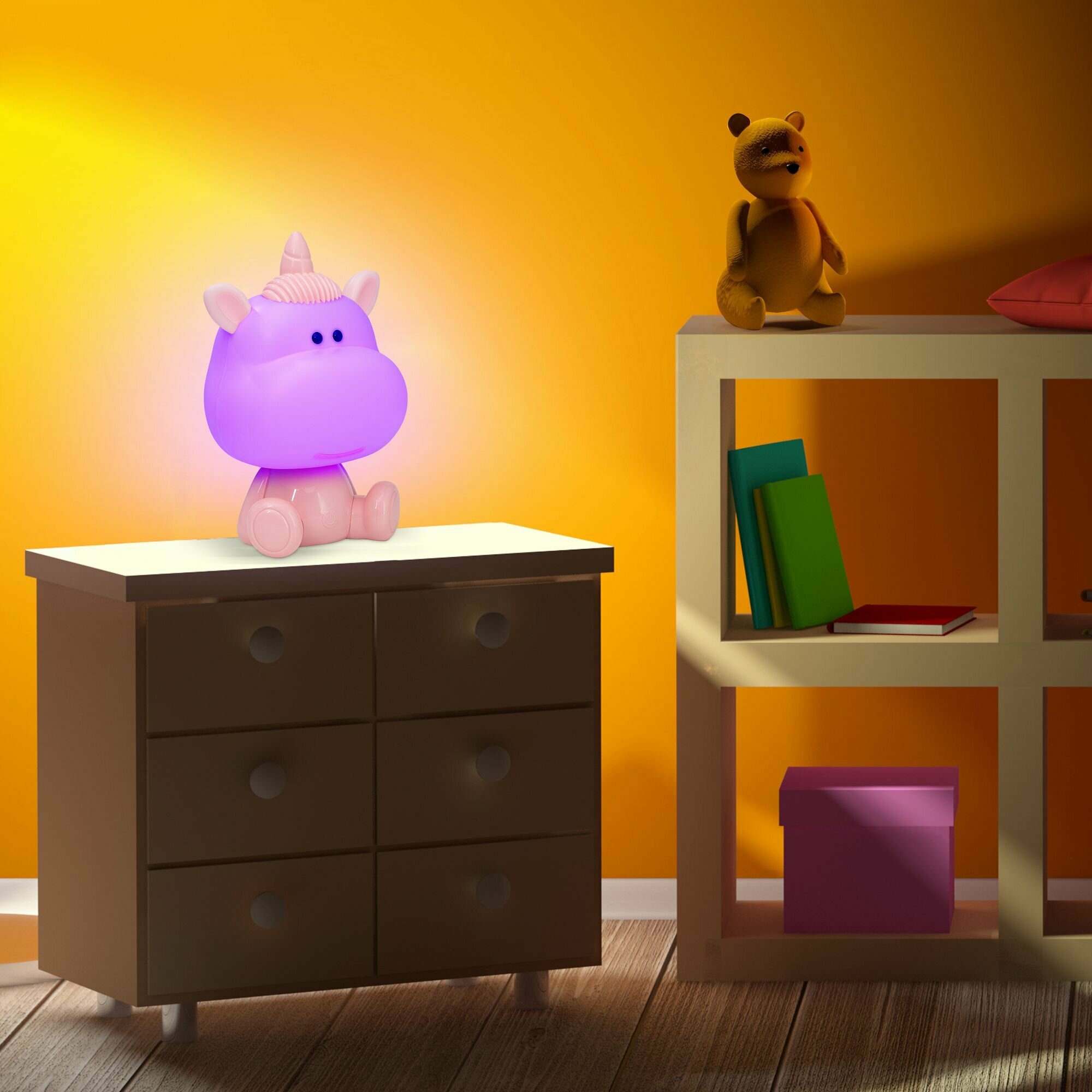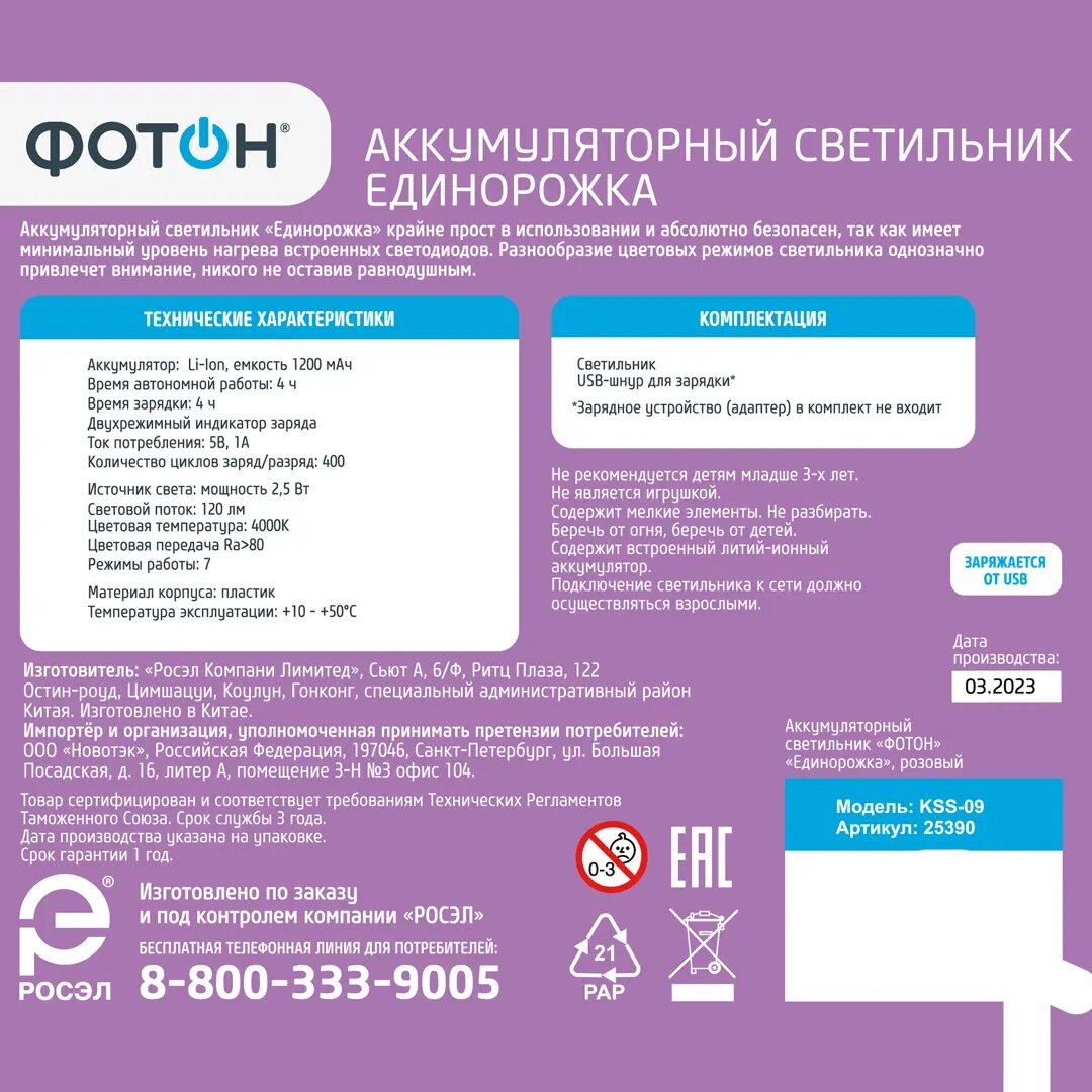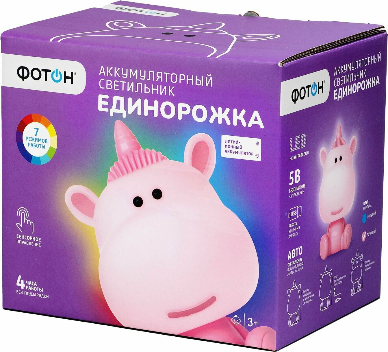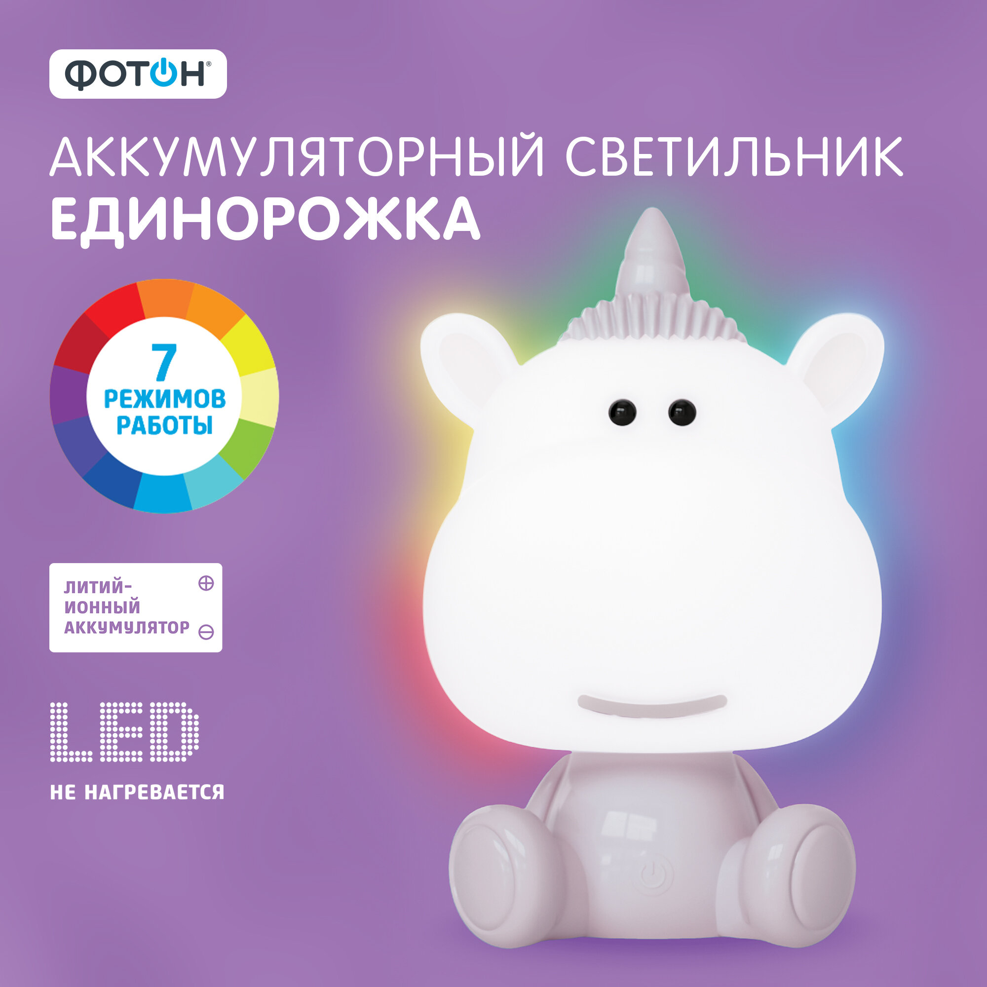 Настольный ночник в виде милого единорога станет верным другом для Вашего ребенка во время сна. Детский ночник крайне прост в использовании, и абсолютно безопасен, так как имеет минимальный уровень нагрева встроенных светодиодов. Разнообразие цветовых режимов светильника и красочное оформление никого не оставят равнодушным и обязательно привлекут детское внимание. Всего доступно 7 режимов работы светильника ночника. Белый дневной свет 4000К доступен в 2 вариантах яркости. А также RGB свечение: красный, зеленый, фиолетовый и режим попеременной смены цветов «мультицвет», который включает в себя 7 цветов радуги. Аккумуляторный светильник оснащен механической кнопкой включения и выключения на обороте ночника, а также сенсорной кнопкой для переключения режимов на животике Единорожки. Ночник детский для сна заряжается от USB через любой гаджет (провод в комплекте). Питание от аккумулятора исключает возможность на долгое время остаться без ночной подсветки (4 часа работы без подзарядки). Помните, спокойный малыш – спокойные родители. Детские ночники ФОТОН не нагреваются. Это одно из важных преимуществ - ночники не способны обжечь руки или стать причиной пожара, ведь дети – те еще исследователи. Светодиодные ночники ФОТОН могут стать замечательной альтернативой стандартным детским подаркам, так как прекрасно сочетают в себе как эстетическую, так и практическую составляющие. Световой поток 120 лм. Размер ночника Единорожки 19*25*22,3 см.