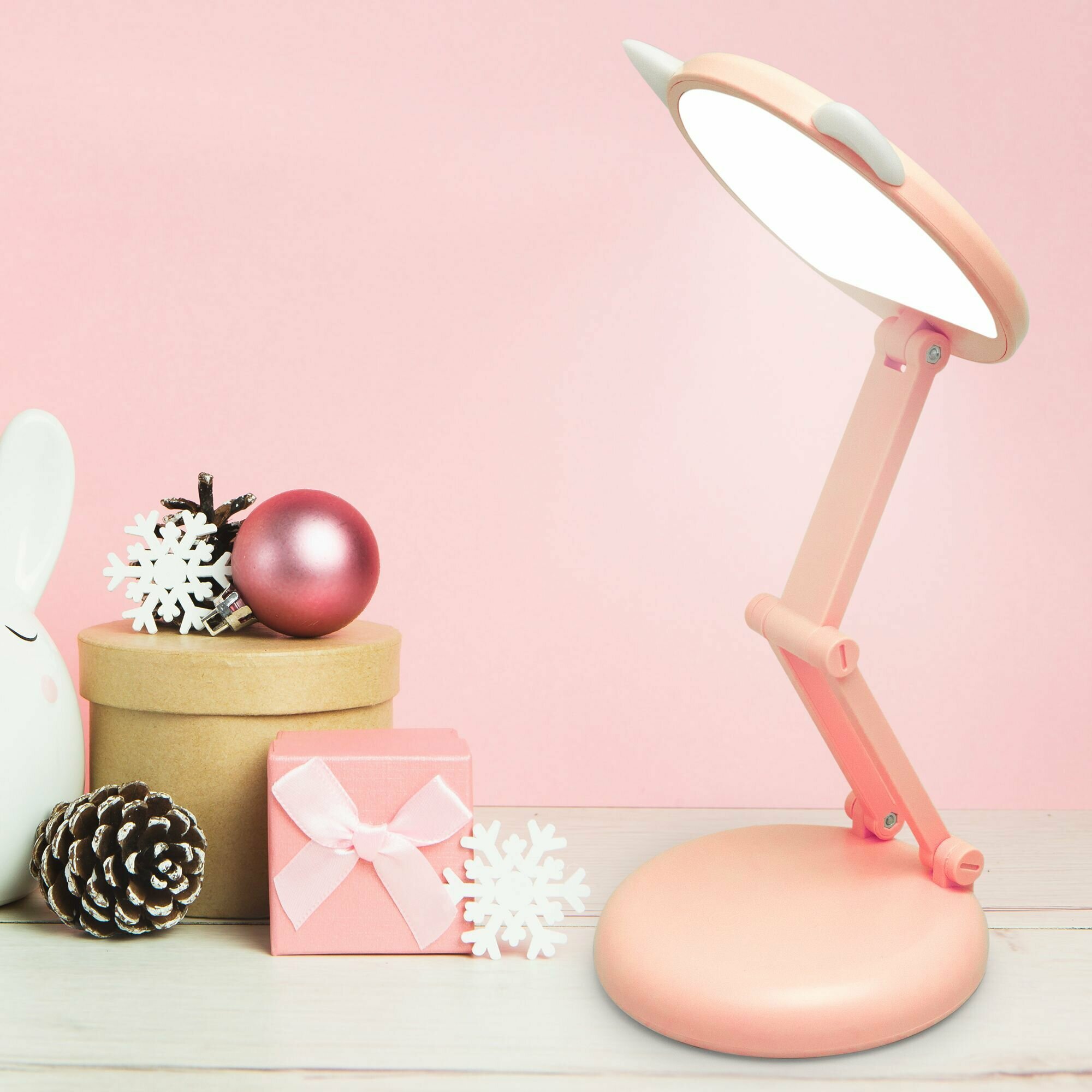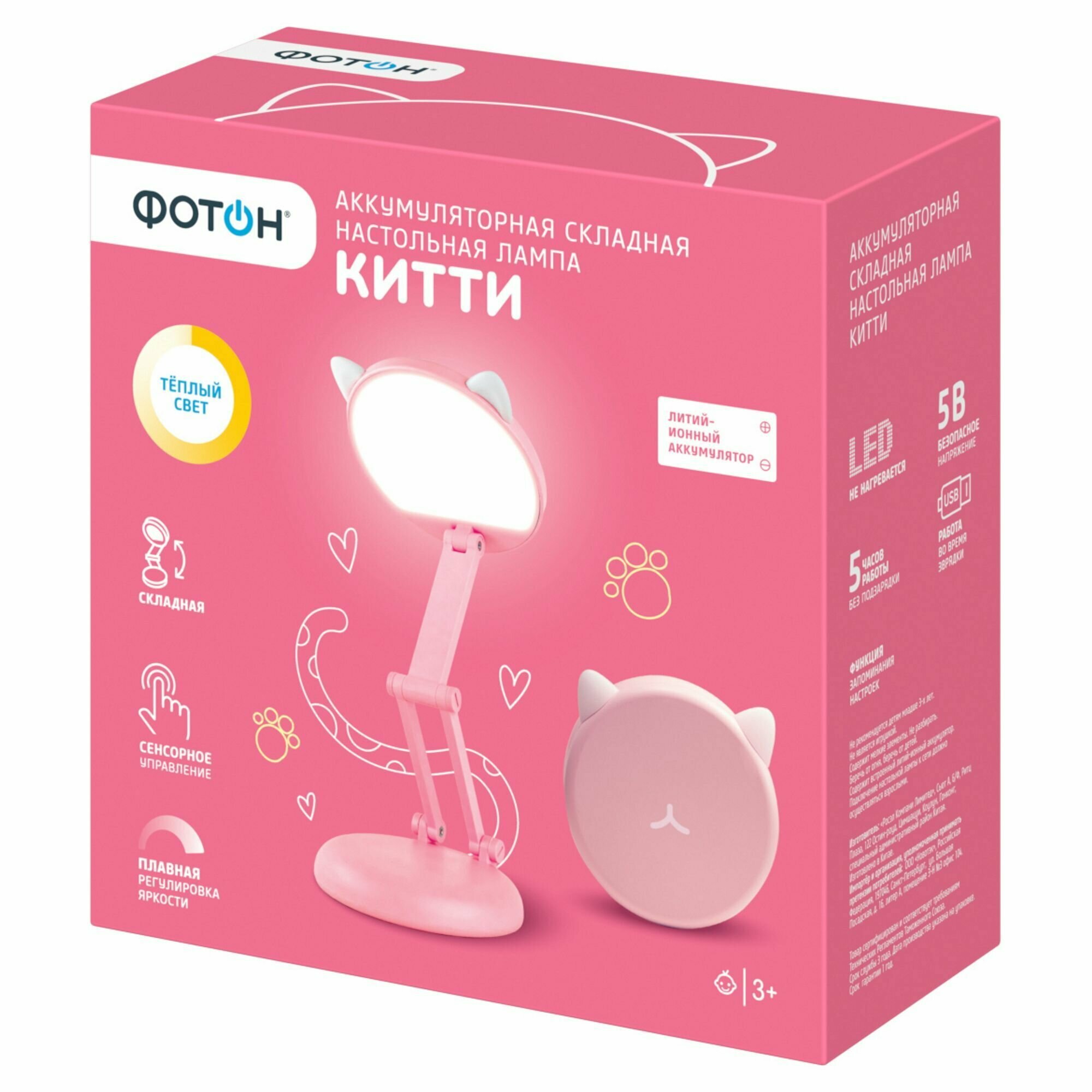 Аккумуляторный настольный светильник Китти с сенсорным управлением, цветовой температурой 4000К и плавной регулировкой яркости удобен и прост в использовании и отлично подойдет для детской комнаты. Благодаря складной конструкции может регулироваться по высоте, менять угол освещения, а также складываться в компактный переносной светильник. Питание: аккумулятор Li-ion, емкость 1200 мАч, подзарядка через USB провод (в комплекте). Время работы без подзарядки: 5 ч.
