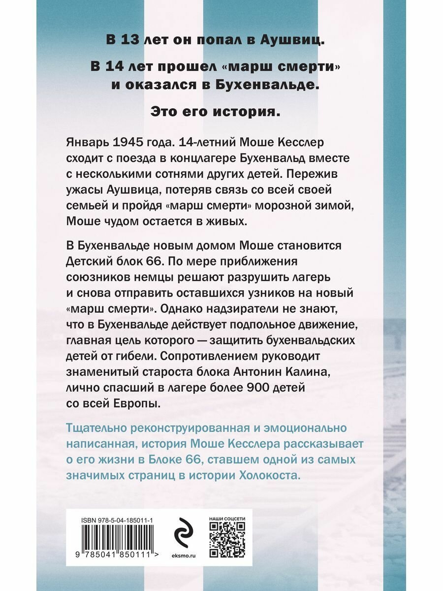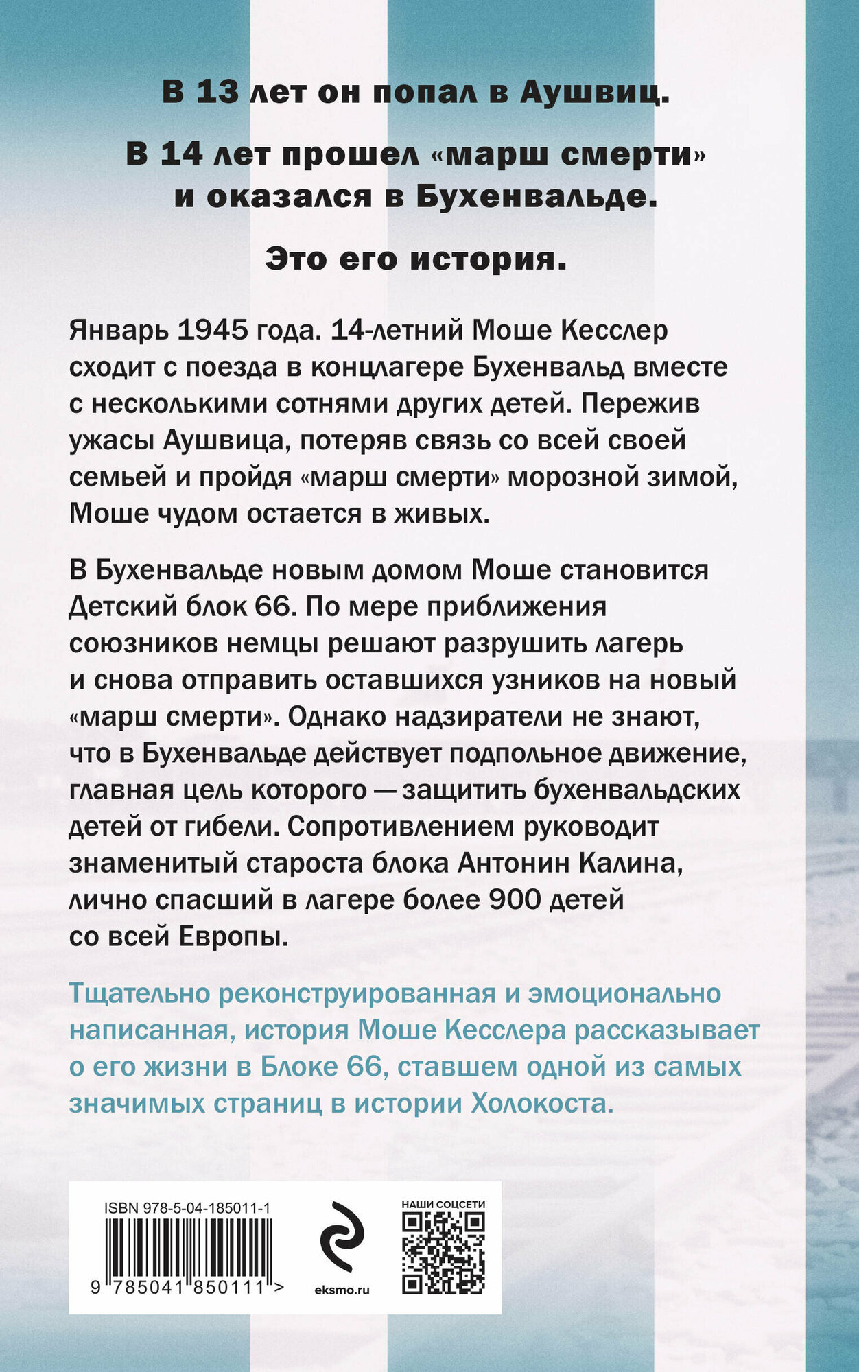В 13 лет он попал в Аушвиц. В 14 лет — прошел «марш смерти» и оказался в Бухенвальде. Это его история. Январь 1945 года. Четырнадцатилетний Моше Кесслер сходит с поезда в концлагере Бухенвальд вместе с несколькими сотнями других детей. Пройдя сквозь ужасы Аушвица, потеряв связь со всей своей семьей и пережив «марш смерти» — двое суток пути на морозе в одной лишь тоненькой пижаме, — Моше чудом остался в живых. В Бухенвальде новым домом Моше становится Детский блок 66. По мере приближения союзников немцы решают разрушить лагерь и снова отправить оставшихся узников на новый «марш смерти». Однако надзиратели не знают, что в Бухенвальде действует подпольное движение, главная цель которого — защитить бухенвальдских детей от гибели. Сопротивлением руководит знаменитый староста блока Антонин Калина, лично спасший в лагере более 900 детей со всей Европы. Тщательно реконструированная и эмоционально написанная, история Моше Кесслера рассказывает о его жизни в Блоке 66, ставшем одной из самых значимых страниц в истории Холокоста.