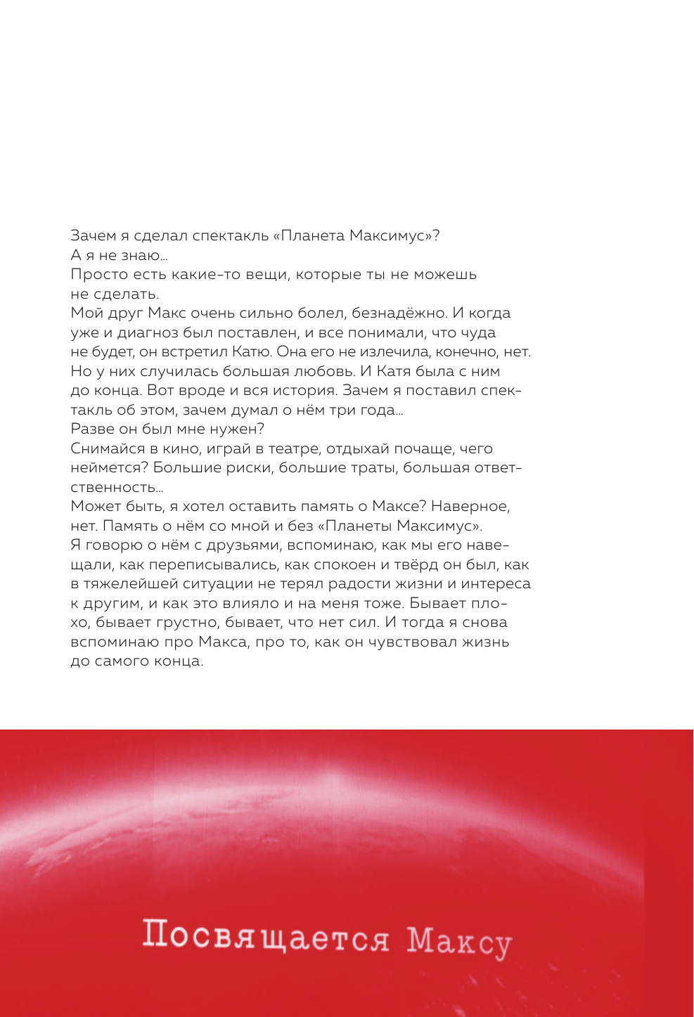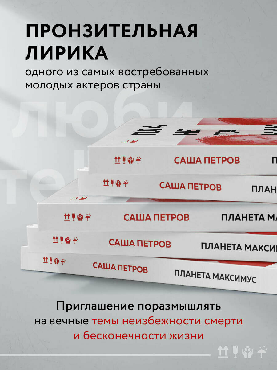 Саша Петров — один из самых востребованных молодых актеров страны, за плечами которого главные роли в блокбастерах «Притяжение», «Т-34», «Лёд», киносериалах «Гоголь», «Полицейский с Рублевки», «Метод» и других масштабных проектах российского кино. Он двукратный лауреат премии «Золотой орёл»: за «Лучшую мужскую роль в кино» и «Лучшую мужскую роль на телевидении». «Планета Максимус» — это второй авторский моноспектакль Саши Петрова. Эта книга рассказывает о героях спектакля, истории его создания и вдохновения. В ней собраны все стихотворения Саши Петрова, которые звучат со сцены, а также те, что молча хранились на страницах его блокнота и теперь публикуются впервые. Со шквальной энергией Саша передает реальную историю пронзительной любви двух молодых людей, которые доказали, что чувства сильнее всего. Петров говорит от лица своего друга Макса, чья трагическая судьба стала вдохновением для постановки и этого сборника. Издание выходит под грифом «Хрупкое» — это общая интонация для спектакля «Планета Максимус» и уязвимости человеческой жизни. Стихи Петрова как быстрые акварельные этюды передают самое интимное, но и самое общее в мире чувство — настоящую любовь.