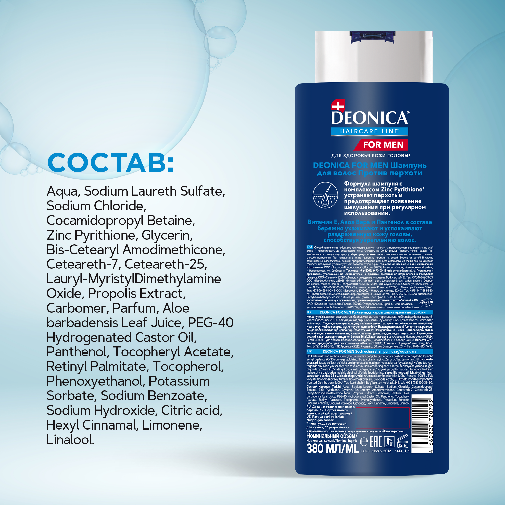 | Состав | Aqua, Sodium Laureth Sulfate, Sodium Chloride, Cocamidopropyl Betaine, Zinc Pyrithione, Glycerin, Bis-Cetearyl Amodimethicone, Ceteareth-7, Ceteareth-25, Lauryl-MyristylDimethylamineOxide, Propolis Extract, Carbomer, Parfum, Aloe barbadensis Leaf Juice, PEG-40 Hydrogenated Сastor Oil, Panthenol, Tocopheryl Acetate, Retinyl Palmitate, Tocopherol, Phenoxyethanol, Potassium Sorbate, Sodium Benzoate, Sodium Hydroxide, Citric acid, Hexyl Cinnamal, Limonene, Linalool |