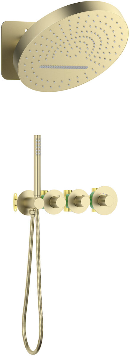 Встраиваемый блок управления душевой системой - 1 шт. Декоративные накладки - 4 шт. Декоративные гильзы - 3 шт. Ручка управления термостатом - 1 шт. Ручки управления режимами (дивертор) - 2 шт. Соединительная трубка с резьбой (латунная) - 1 шт. Держатель ручной лейки с подключением шланга душа (латунный) - 1 шт. Ручная лейка (латунная) - 1 шт. Шланг душа 1,5 м (латунный) - 1 шт. Встраиваемый блок для монтажа верхнего душа - 1 шт. Соединительные трубки для установки тропического душа - 2 шт. Пробки для проверки давления (герметичность) тропического душа - 2 шт. Защитная крышка - 1 шт. Тропический душ 2-х режимный (пластик) - 1 шт. Крепежные винты для фиксации тропического душа - 2 шт. Инструкция - 1 шт.