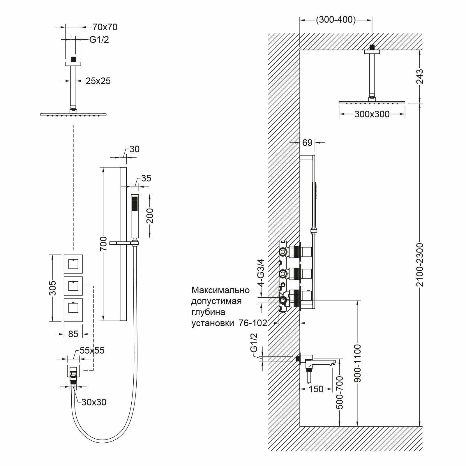 Встраиваемый блок управления душевой системой - 1 шт. Декоративные накладки - 3 шт. Декоративные гильзы - 2 шт. Ручки управления режимами (дивертор) - 2 шт. Ручка управления термостатом - 1 шт. Отвод из стены с подключением шланга душа (латунный) - 1 шт. Шланг душа 1,5 м (латунный) - 1 шт. Ручной душ (латунный) - 1 шт. Держатель лейки тропического душа (латунный) - 1 шт. Тропический душ (латунный) - 1 шт. Инструкция - 1 шт.