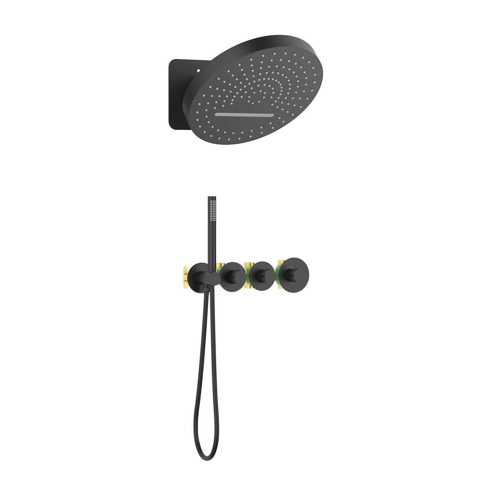 Встраиваемый блок управления душевой системой - 1 шт. Декоративные накладки - 4 шт. Декоративные гильзы - 3 шт. Ручка управления термостатом - 1 шт. Ручки управления режимами (дивертор) - 2 шт. Соединительная трубка с резьбой (латунная) - 1 шт. Держатель ручной лейки с подключением шланга душа (латунный) - 1 шт. Ручная лейка (латунная) - 1 шт. Шланг душа 1,5 м (латунный) - 1 шт. Встраиваемый блок для монтажа верхнего душа - 1 шт. Соединительные трубки для установки тропического душа - 2 шт. Пробки для проверки давления (герметичность) тропического душа - 2 шт. Защитная крышка - 1 шт. Тропический душ 2-х режимный (пластик) - 1 шт. Крепежные винты для фиксации тропического душа - 2 шт. Инструкция - 1 шт.
