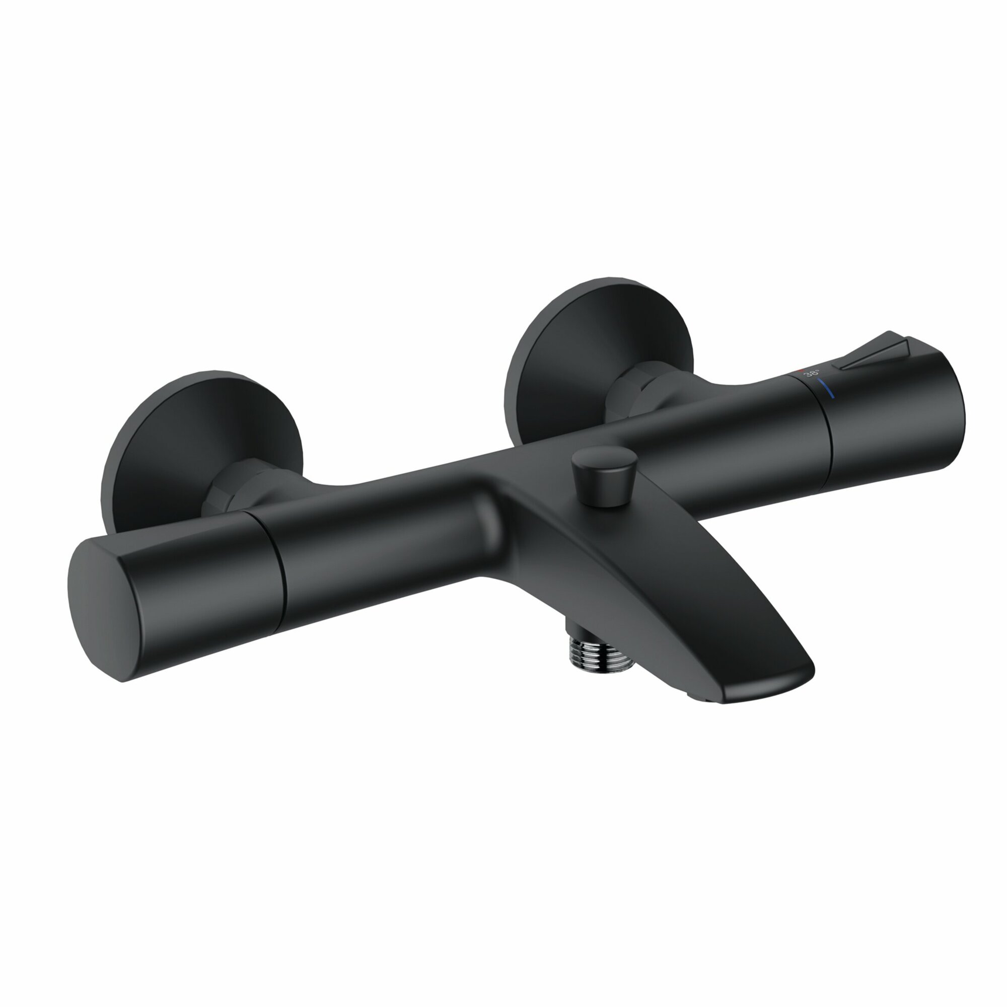 Смеситель для ванны. Цвет-черный матовый. Управление: термостат. Механизм: термостатический картридж. Рукоятка выбора температуры с ограничителем горячей воды при 38 градусов. Излив: фиксированный. Аэратор М 24 х 1/В. Автоматический переключатель душ,ванна. Клапан защиты от обратного потока.
