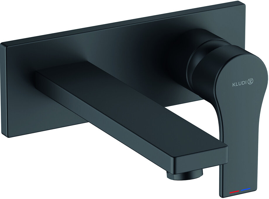 Смеситель для умывальника, внешняя монтажная часть, длина излива 180 мм, черный матовый, ZENTA SL. Дизайн коллекции KLUDI ZENTA SL основан на геометрических формах, которые преломлены нежными линиями и аккуратными закруглениями. Плавные переходы между корпусом, изливом и рычагом смесителя придают продуктам легкость и утонченность формы, одновременно становясь противовесом сырой, геометрической основы.