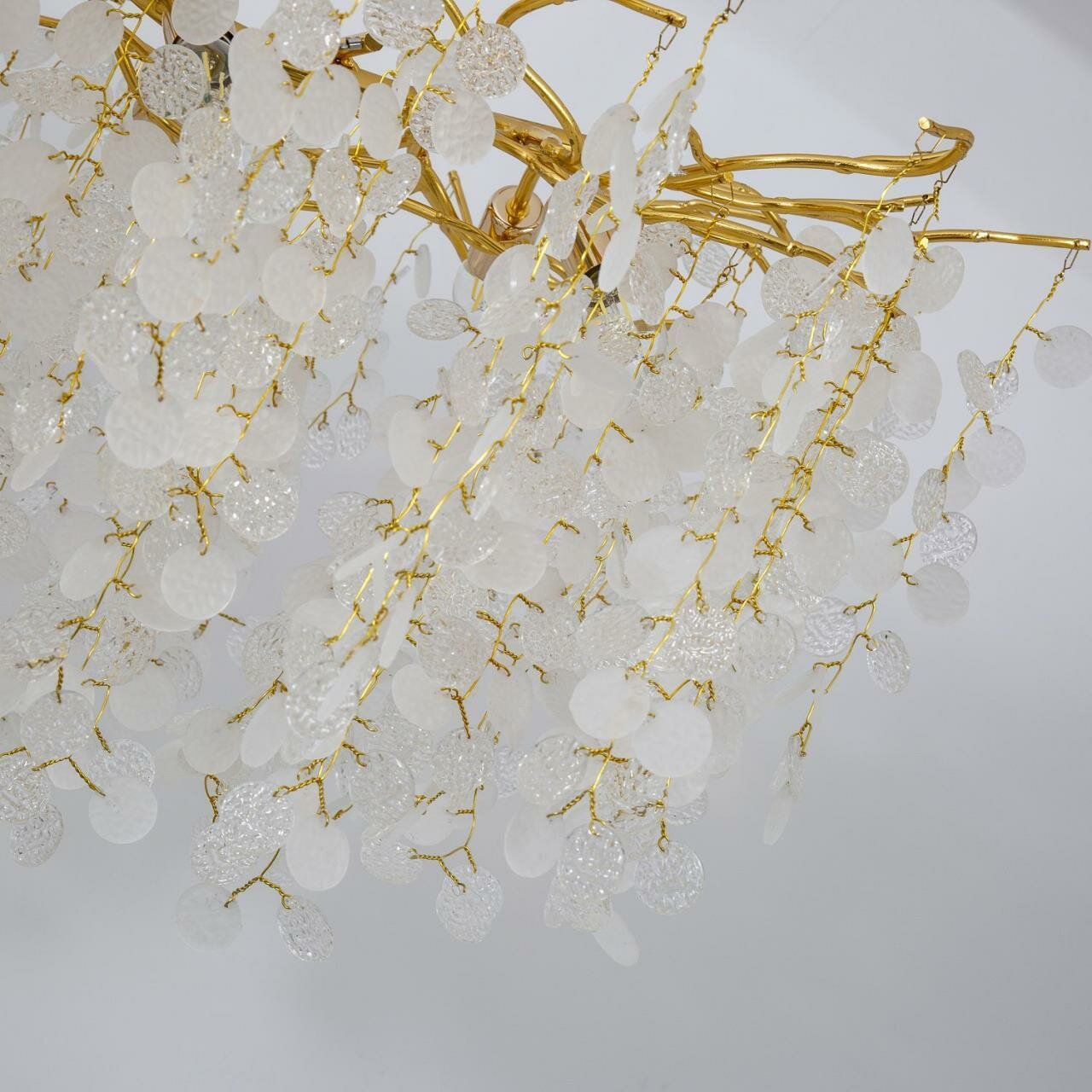 Восхитительная модель отлично подойдет для установки на потолок в гостиной, оформленной в стиле флористика. Подвесная люстра осветит помещение площадью 30 кв.м. Может использоваться для натяжного потолка.