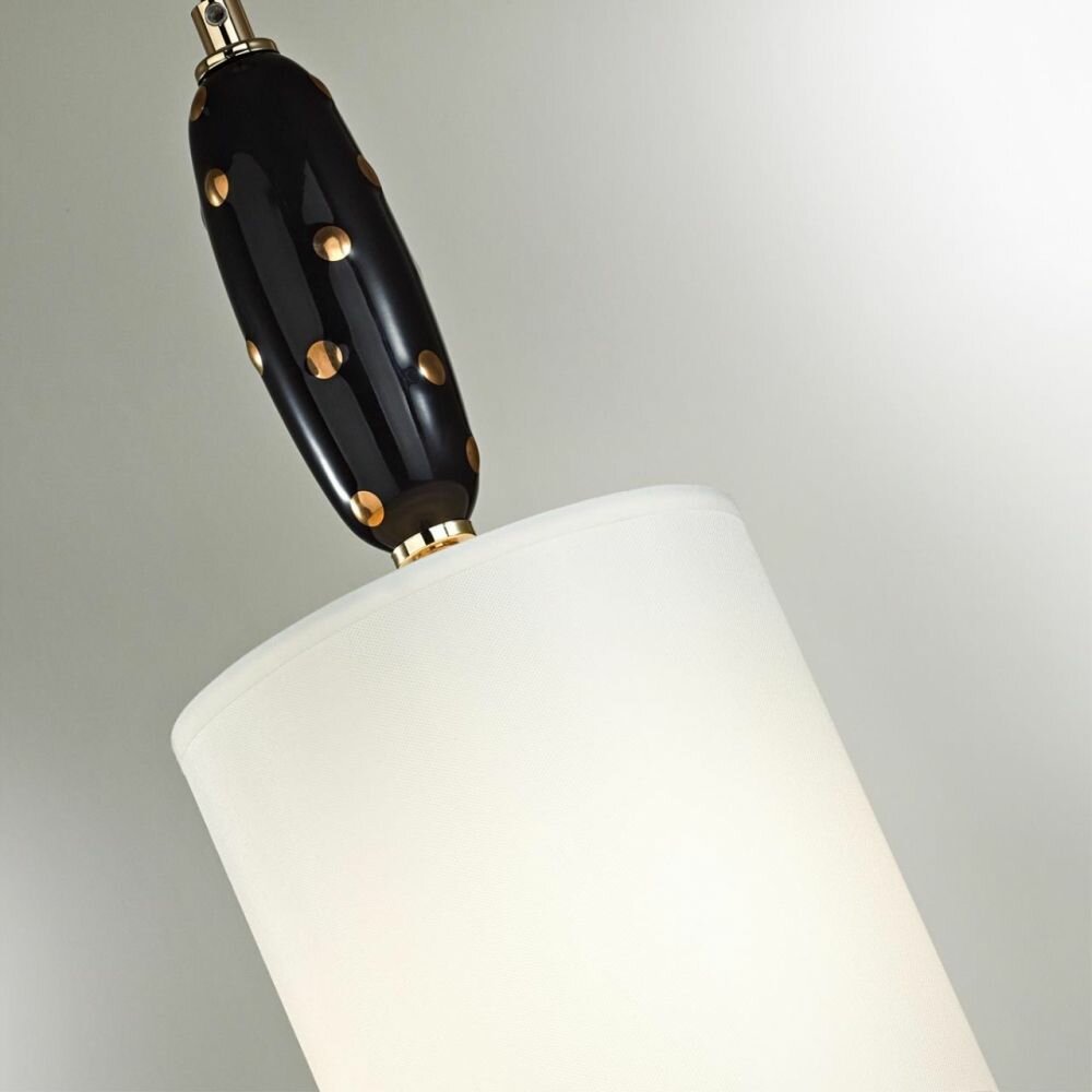 Черная глянцевая керамика ручной работы линии Pollen будто усыпана золотой пыльцой. Подвесной абажурный светильник с матовым рассеивателем включает 5 ламп, что позволяет использовать его в качестве основного освещения. Лаконичная форма малого подвеса, настольных ламп и бра будет отлично смотреться в самых разнообразных стилях интерьера — от неоклассиски и эклектики до модерна и поп-арта.