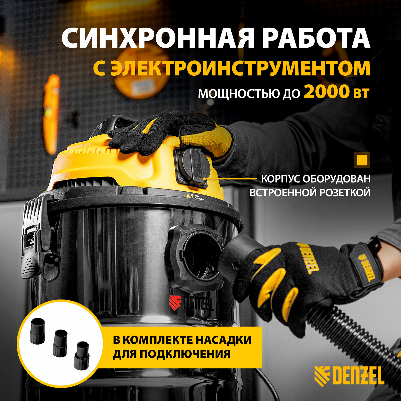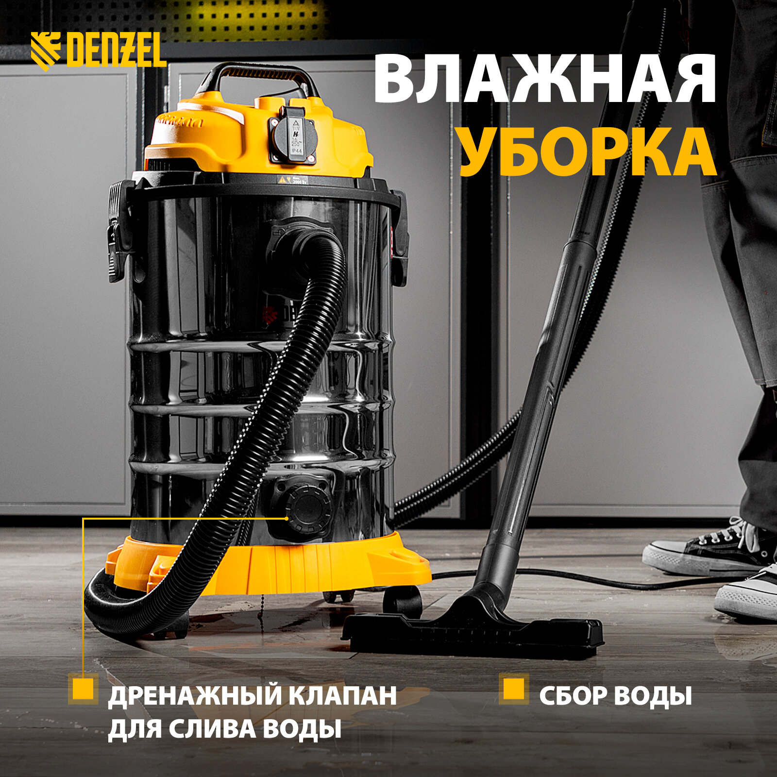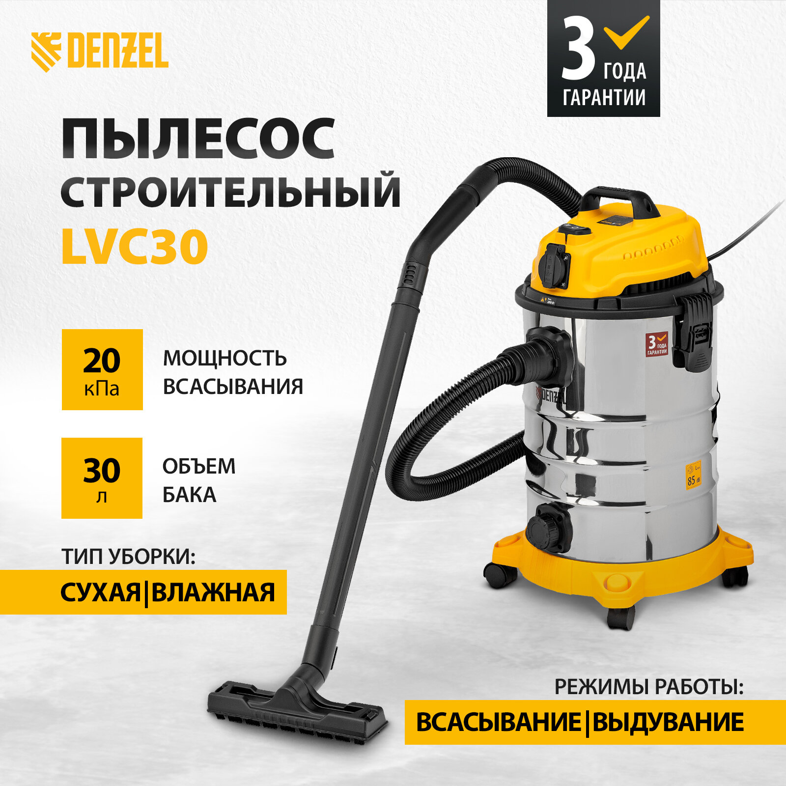 **Пылесос строительный Denzel LVC30** предназначен для сухой и влажной уборки помещений, совмещения с электроинструментами для принудительного удаления продуктов пиления, сгорания, строгания. Позволяет убирать крупные частицы мусора. За счет длинного шланга и наличия сменных насадок можно удалить мусор из самых труднодоступных мест.