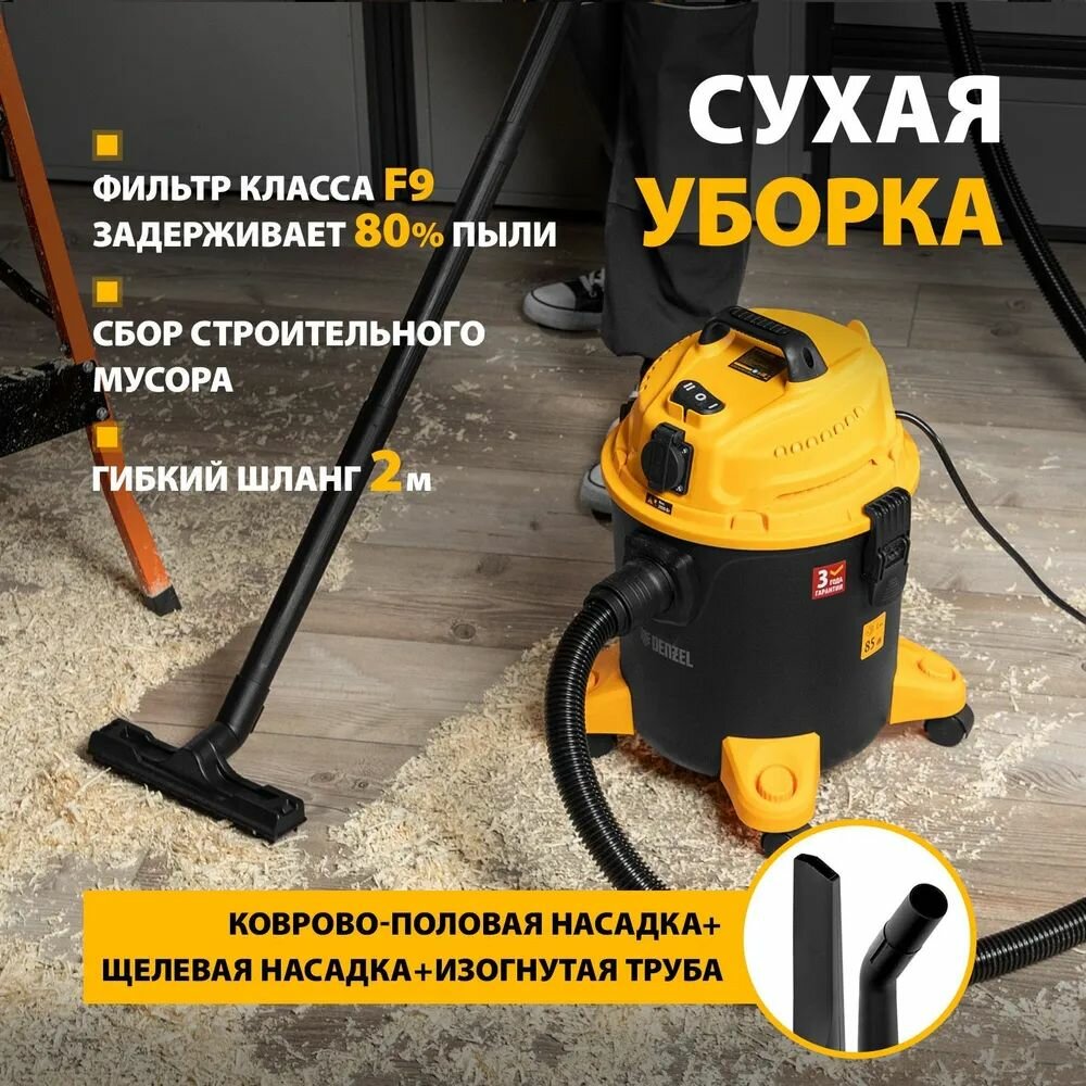 **Пылесос строительный Denzel LVC20** предназначен для сухой и влажной уборки помещений, совмещения с электроинструментами для принудительного удаления продуктов пиления, сгорания, строгания. Позволяет убирать крупные частицы мусора. За счет длинного шланга и наличия сменных насадок можно удалить мусор из самых труднодоступных мест.