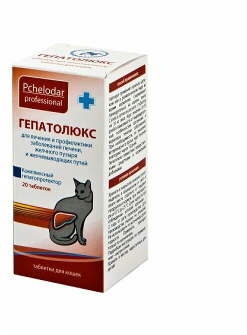 Гепатолюкс назначают животным для профилактики и лечения острых и хронических заболеваний печени различной этиологии в составе комплексной терапии или в качестве монопрепарата, для лечения заболеваний желчного пузыря, желчевыводящих путей различного генеза, жировой дистрофии и дегенерации печени.Пчелодар Гепатолюкс для профилактики и лечения печени у кошек, инструкция по применениюСостав (В 1 таблетке на 10 КГ) - мелкие породы собак фосфолипиды эссенциальные (EPL-субстанция) растительного происхождения из семян сои — 50 мг, метионин — 70 мг, соль глицирризиновой кислоты — 10 мг, глицин — 10 мг, L-аргинин — 50 мг, экстракт расторопши пятнистой (силимарин) — 15 мг, экстракт листьев артишока полевого — 20 мг, экстракт пчелиного маточного молочка -1 мг и вспомогательные компоненты. Состав (В 1 таблетке на 20 КГ) - для собак взрослых собак фосфолипиды эссенциальные (EPL-субстанция) растительного происхождения из семян сои -100 мг, метионин -140 мг, соль глицирризиновой кислоты — 20 мг, глицин — 20 мг, L-аргинин — 100 мг, экстракт расторопши пятнистой (силимарин) — 30 мг, экстракт листьев артишока полевого — 40 мг, экстракт пчелиного маточного молочка — 2 мг и вспомогательные компоненты.Фармакологические свойства Биологические свойства кормовой добавки Гепатовет Актив обусловлены входящими в состав биологически активными веществами, обеспечивающими антиоксидантную защиту клеток печени. Метионин предотвращает избыточное накопление жирорастворимых соединений в клетках печени, а также стимулирует быстрое выведение различных токсинов, включая тяжелые металлы, из клеток печени и почек. Орнитин регулирует цикл синтеза мочевины и снижает токсическое воздействие аммиака на организм животных. Растительные экстракты стимулируют восстановительные процессы, повышают защитные свойства клеток печени, ускоряют процессы секреции и выведения желчи. Введение добавки в рационы животных улучшает функциональное состояние печени и ее дезинтоксикационную функцию, способствует сохранению и восстановлению структуры гепатоцитов, ускоряет регенерацию клеток печени.Дозы и способ применения Гепатолюкс таблетки применяют животным перорально (внутрь), индивидуально во время кормления из расчета 1 таблетка на 20 кг массы 2 раза в день. Курс лечения составляет 20-30 дней, в зависимости от индивидуальных особенностей организма и характера течения заболевания. При необходимости, по указанию ветеринарного врача, прием препарата можно возобновить через 10 дней.Меры предосторожности При работе с препаратом Гепатолюкс следует соблюдать общие правила личной гигиены и техники безопасности, предусмотренные при работе с лекарственными препаратами. Пустые флаконы из-под препарата утилизируют с бытовыми отходами. Неиспользованный препарат утилизируют в соответствии с требованиями законодательства.Противопоказания Индивидуальная повышенная чувствительность к компонентам препарата. Не рекомендуется назначать животным с печеночной энцефалопатией и тяжелой .