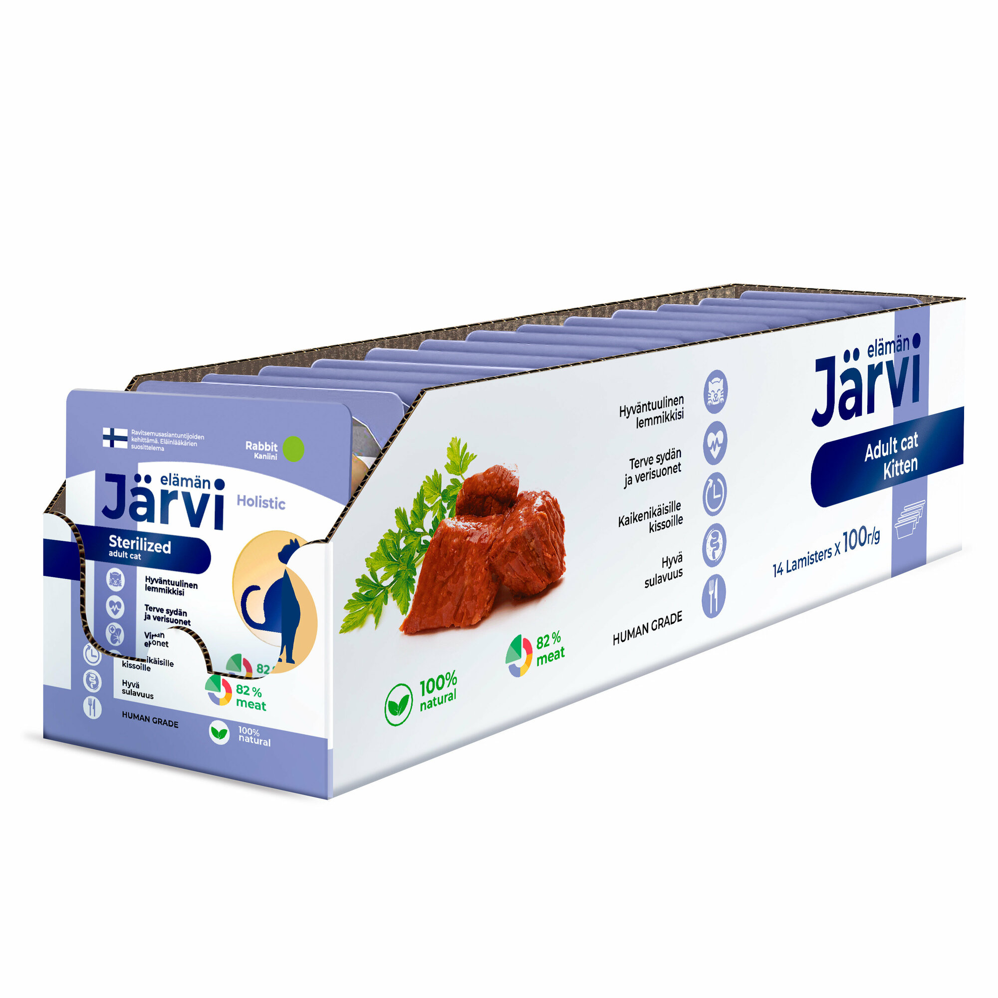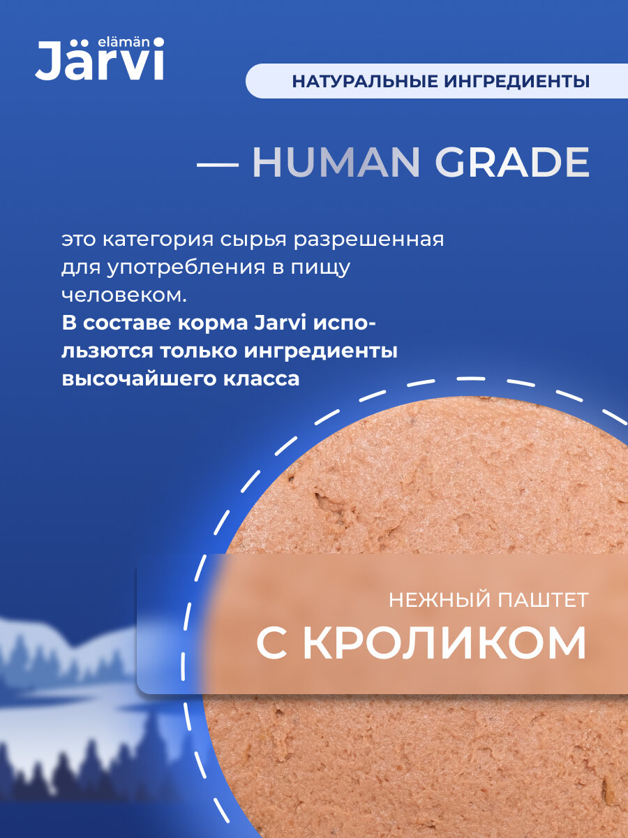 Jarvi - это холистический полнорационный корм для сбалансированного питания. Он соответствует высоким стандартам финского качества, разработан нутрициологами и одобрен ветеринарами. Паштет содержит большое количество мясных ингредиентов (82%) категории HUMAN GRADE – высококачественный продукт, подходящий в пищу человеку, а также все необходимые витамины и микроэлементы для полноценного развития и здоровья вашего питомца.