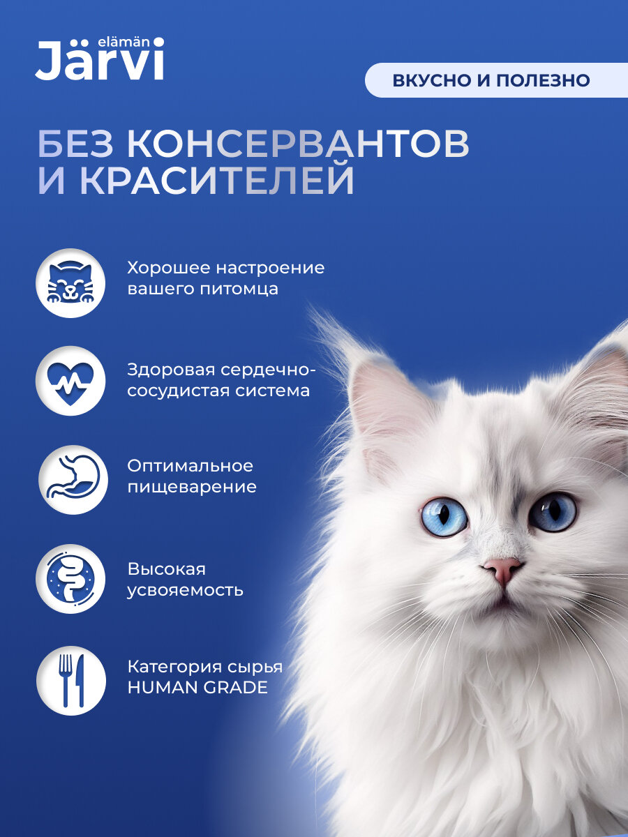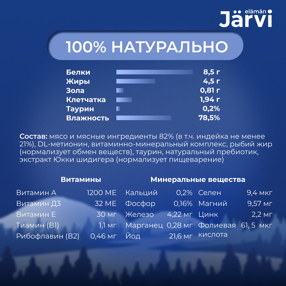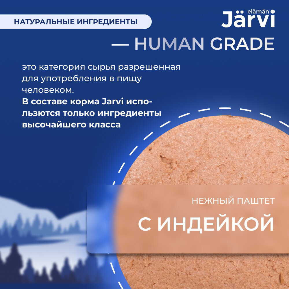 Jarvi - это холистический полнорационный корм для сбалансированного питания. Он соответствует высоким стандартам финского качества, разработан нутрициологами и одобрен ветеринарами. Паштет содержит большое количество мясных ингредиентов (82%) категории HUMAN GRADE – высококачественный продукт, подходящий в пищу человеку, а также все необходимые витамины и микроэлементы для полноценного развития и здоровья вашего питомца.