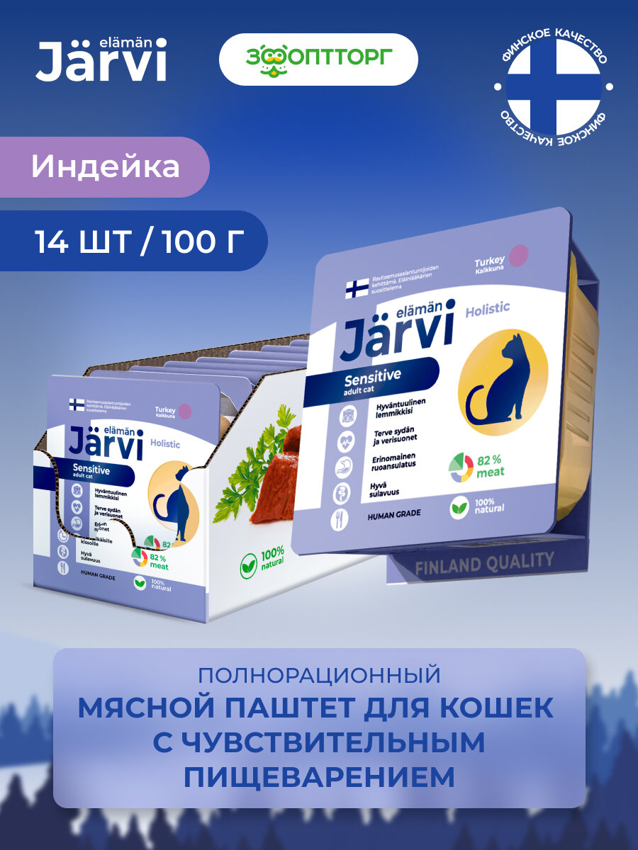 Сервис сравнения цен СкидкаГИД предлагает сравнить цены на товар «Jarvi мясной паштет с индейкой для кошек с чувствительным пищеварением (100 г.)»