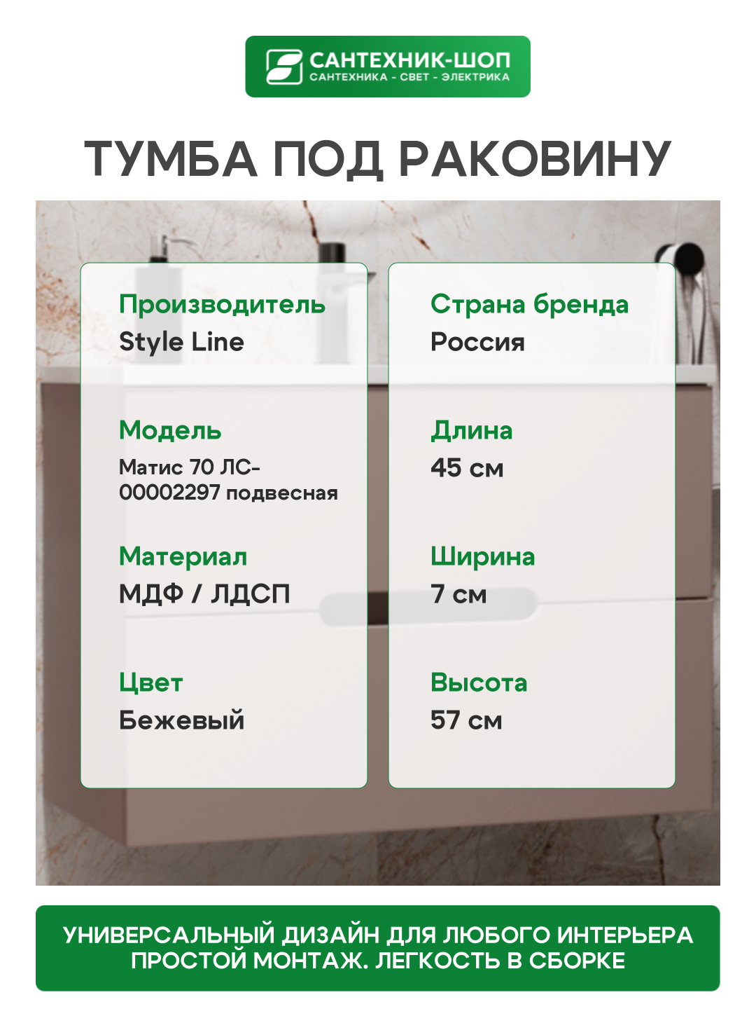Тумба под раковину Style Line Матис 70 ЛС-00002297 подвесная.