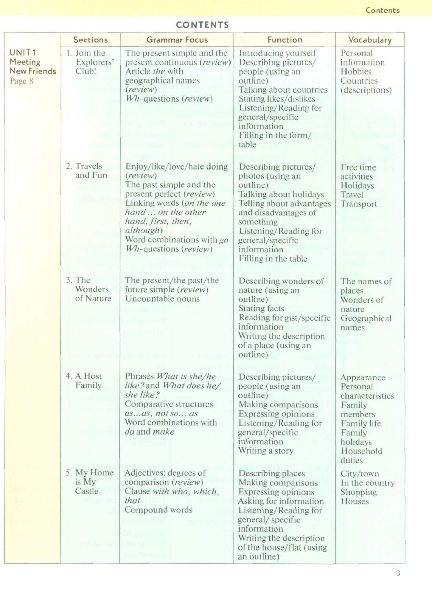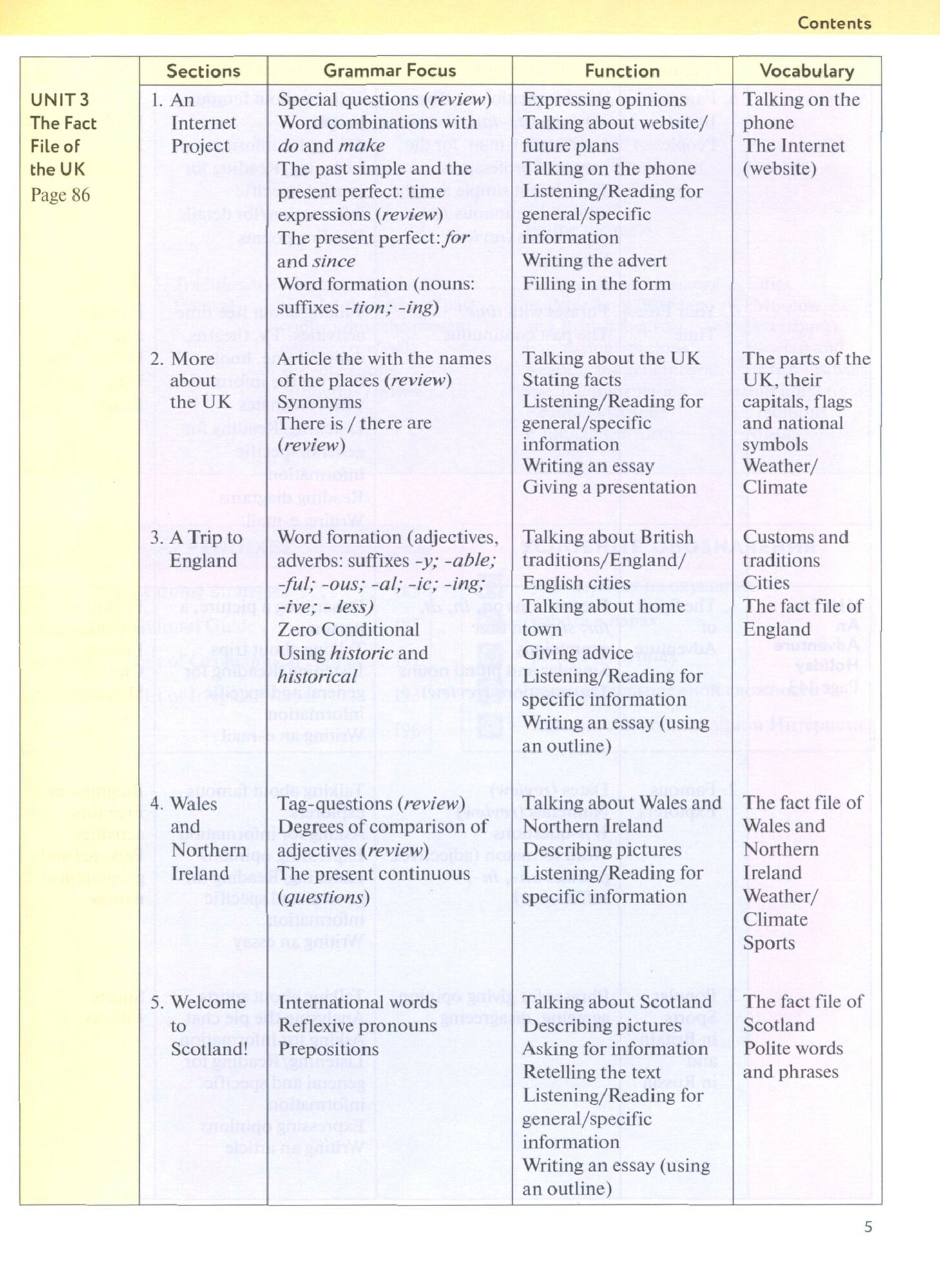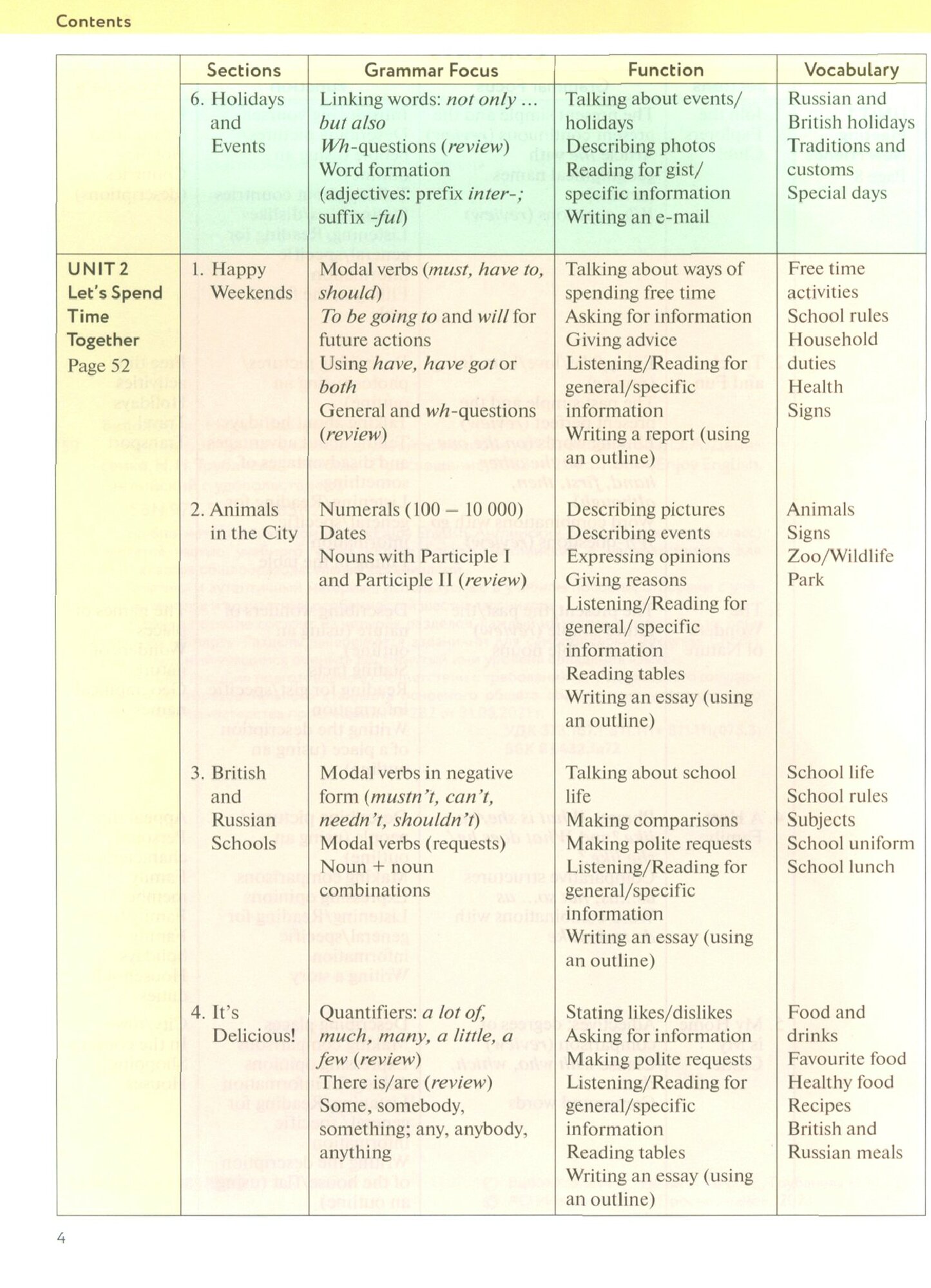 Учебное пособие состоит из четырёх разделов, каждый из которых рассчитан на одну учебную четверть. Разделы завершаются заданиями для самопроверки (Progress Check), позволяющими учащимся оценить достигнутый ими уровень овладения языком.