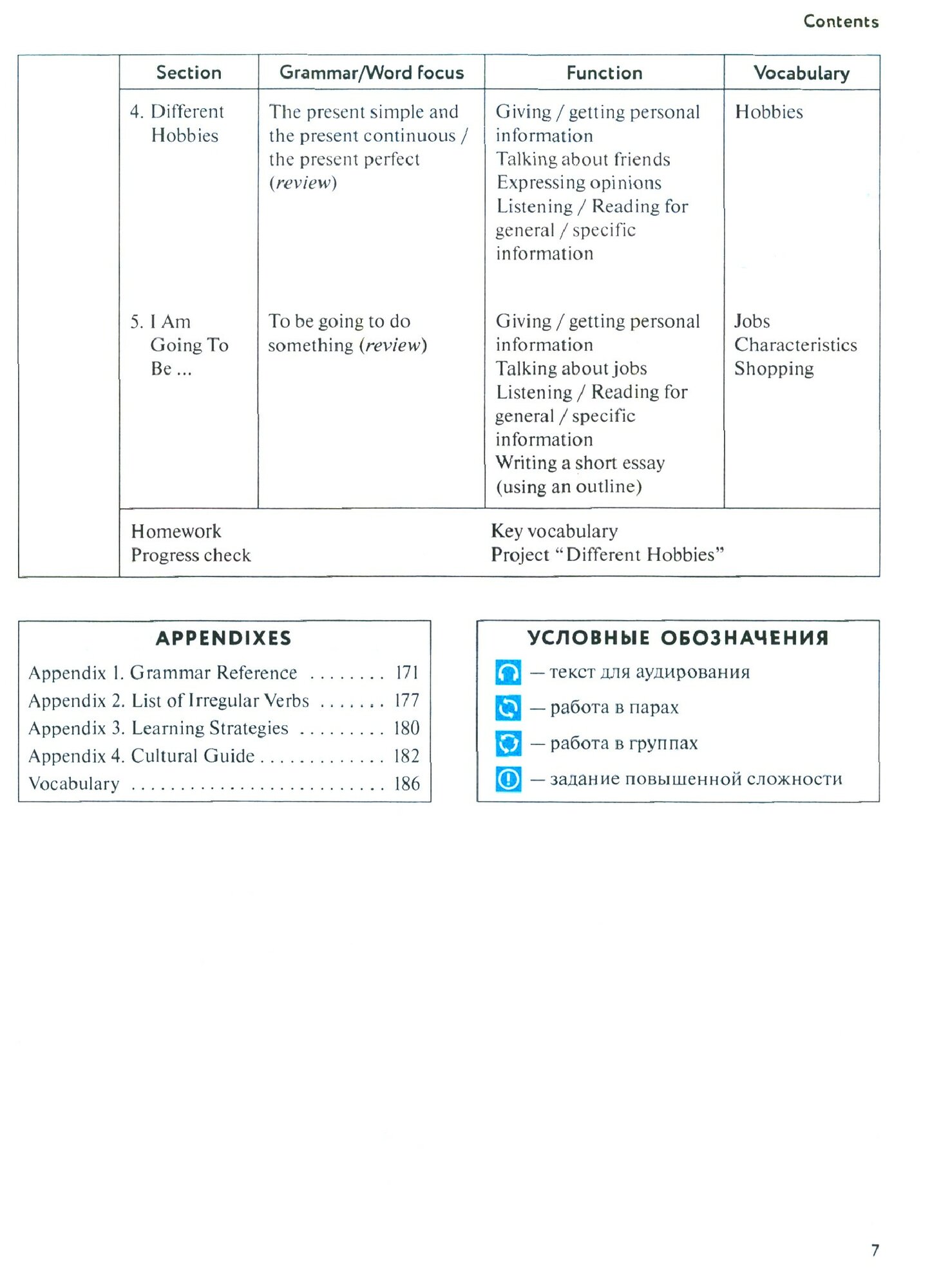 Учебное пособие состоит из четырёх разделов, каждый из которых рассчитан на одну учебную четверть. Разделы завершаются заданиями для самопроверки (Progress Check), позволяющими учащимся оценить достигнутый ими уровень овладения языком.