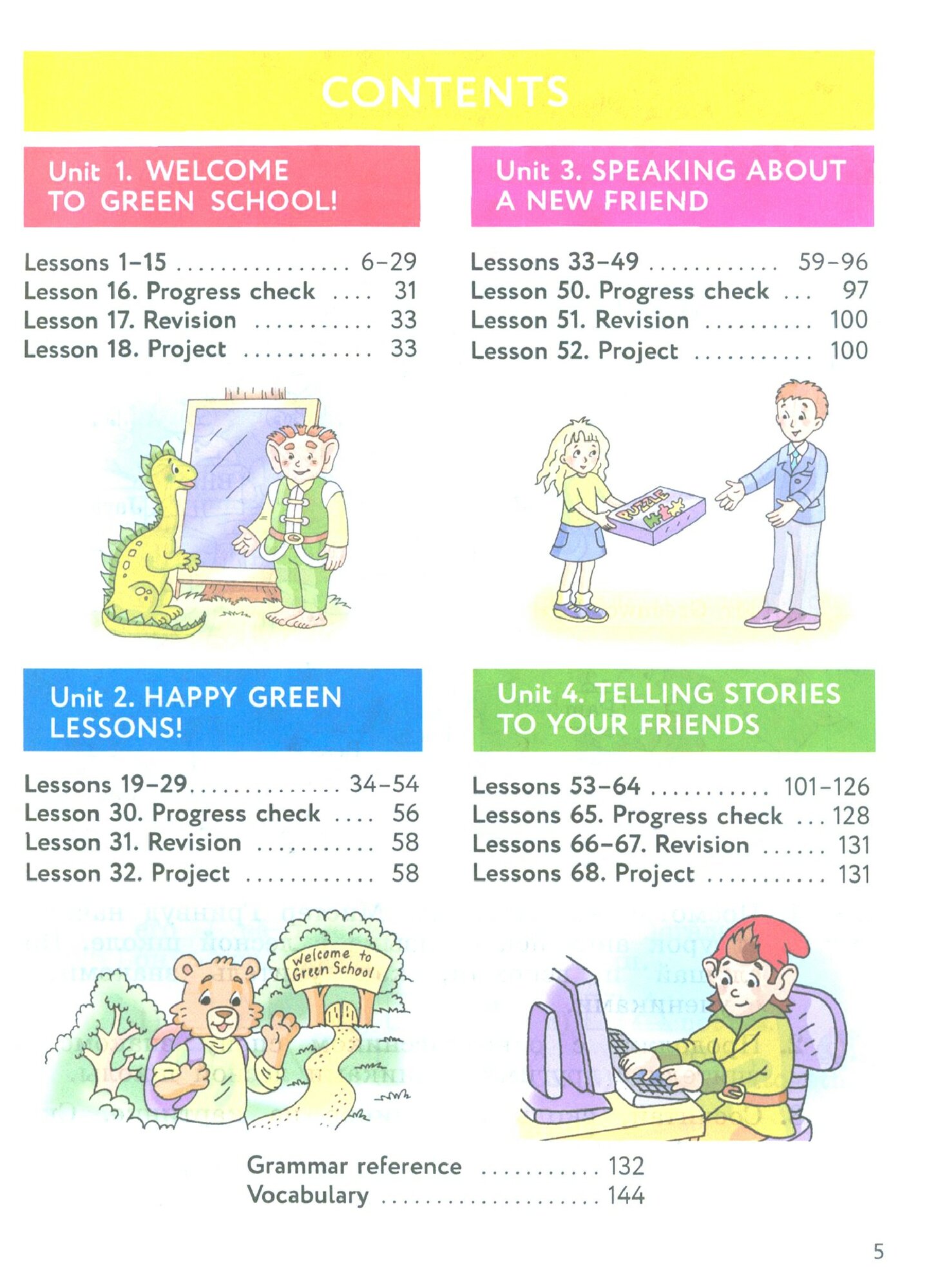Учебное пособие состоит из четырех разделов, каждый из которых рассчитан на одну учебную четверть. Разделы завершаются проверочными заданиями (Progress Check), позволяющими оценить достигнутый школьниками уровень овладения языком в начальной школе.