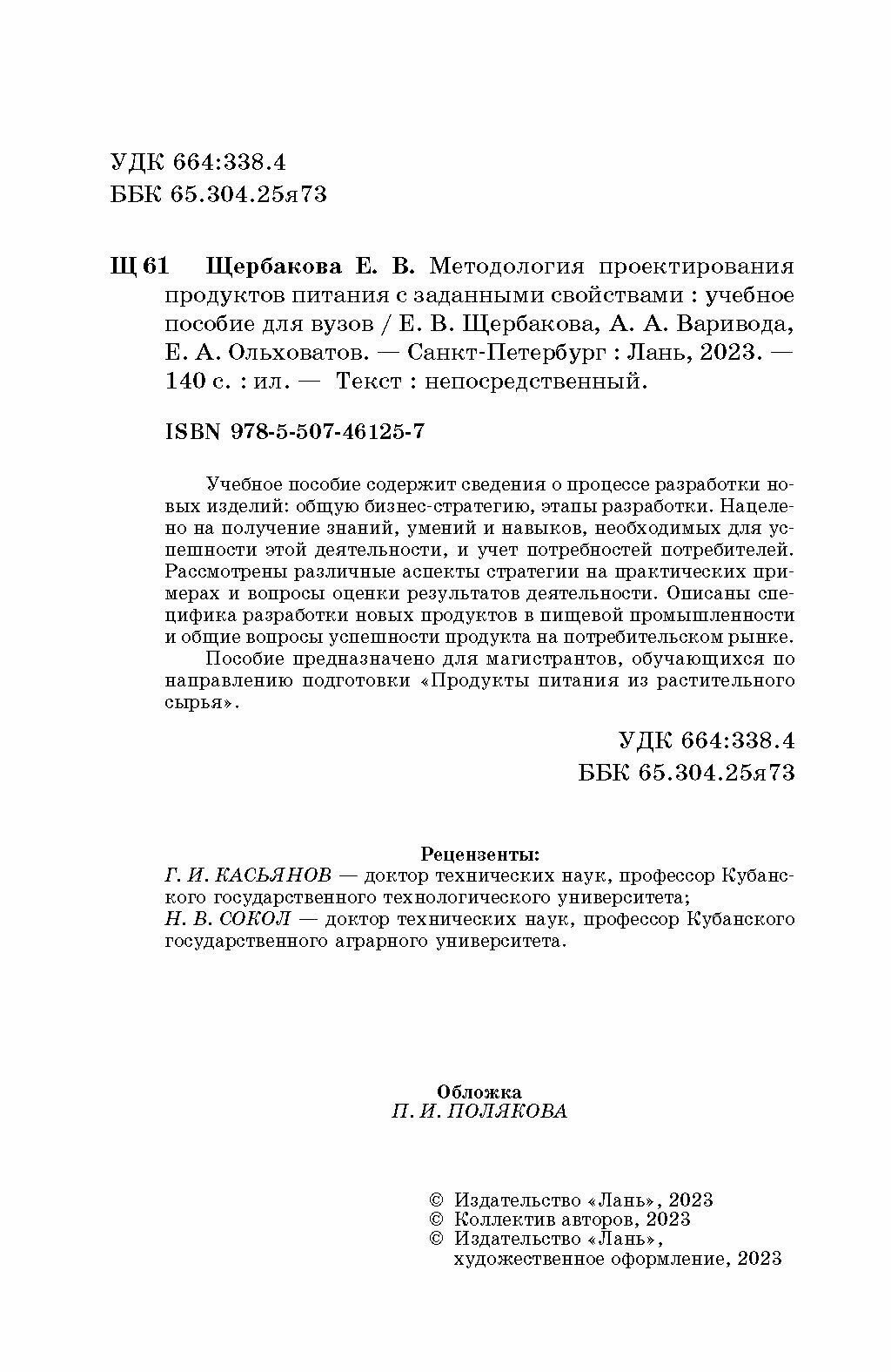 Методология проектирования продуктов питания с заданными свойствами. Учебное пособие для вузов (Щербакова Елена Владимировна, Ольховатов Егор Анатольевич, Варивода Альбина Алексеевна); Лань, 2023