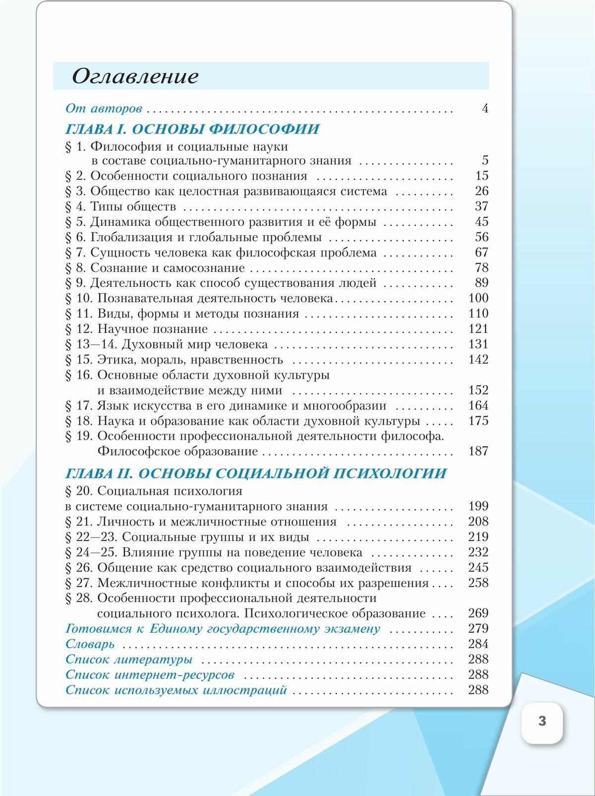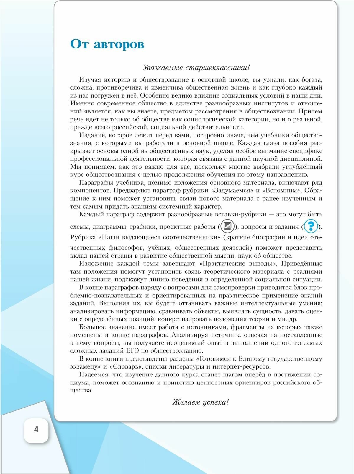 Первая часть учебного пособия знакомит учащихся с главными характеристиками человеческой личности и общества в целом и включает систему знаний, составляющих основы философии и социальной психологии. Методический аппарат ориентирован на активную работу десятиклассников с различными источниками социальной информации и проектную деятельность. Работа с учебным пособием будет способствовать личностному развитию школьников, воспитанию у них гражданственности и социальной ответственности, поможет учащимся подготовиться к сдаче Единого государственного экзамена.