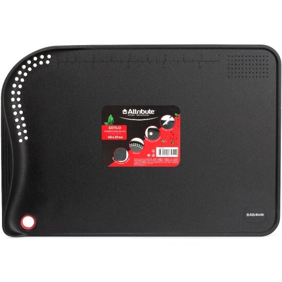 Доска разделочная пластик ESTILO 40x27x2.8 см. Разделочная доска - обязательный атрибут любой кухни. Разделочная доска оснащена сливным дуршлагом - Нарезанные продукты легко можно промыть или удалить лишнюю жидкость. В поверхности разделочной доски встроена терка для чеснока и имбиря. Доска для резки продуктов имеет мерную линейку и кольцо для удобства при хранении. Разделочная доска устойчива к порезам, не затупляет ножи.