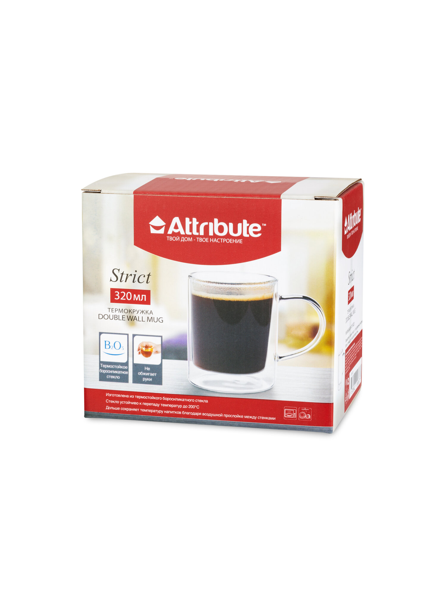 Термокружка STRICT - отличный вариант для подачи латте, какао, десертов и тд. Ее конструкция - это двойные стеклянные стенки с воздушной прослойкой между ними. Термокружка для кофе изготовлена из боросиликатного стекла, способного выдерживать температуру до 200 градусов. В такой стеклянной кружке напиток дольше не остынет. Чашка стеклянная покорит сердце ваших гостей, ведь подавать в ней напитки очень эффектно. Объем термокружки прозрачной 320 мл. Подача напитков и десертов в термокружке выглядит эстетично и красиво.Термокружка STRICT упакована в красочную индивидуальную коробку, поэтому ее можно подарить на день рождения, на новоселье, на 8 марта. Термостакан с двойными стенками можно мыть в посудомоечной машине и использовать в СВЧ.