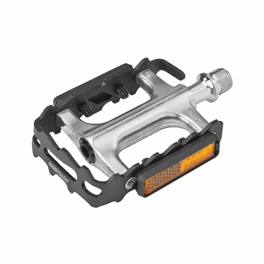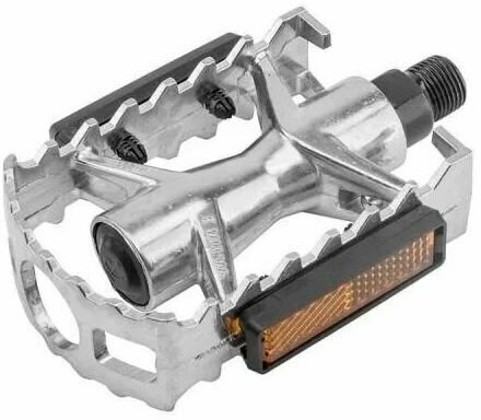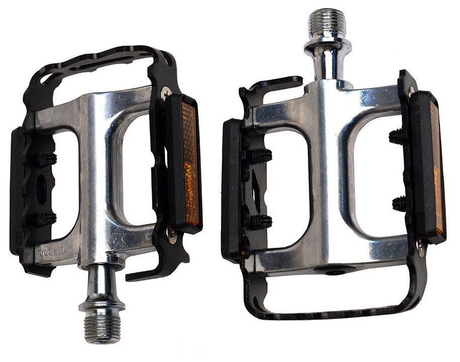 Feimin - это пара качественных педалей для вашего горного байка. Корпус каждой педали выполнен из алюминия, к нему прикреплена стальная клетка с шипами и светоотражающими элементами. Внутри установлены надежные подшипники. Стандарт оси: Cr-Mo 9/16. Размер одной педали: 106х68 мм. Цвет - черный/серебристый. Вес пары: 345 грамм.