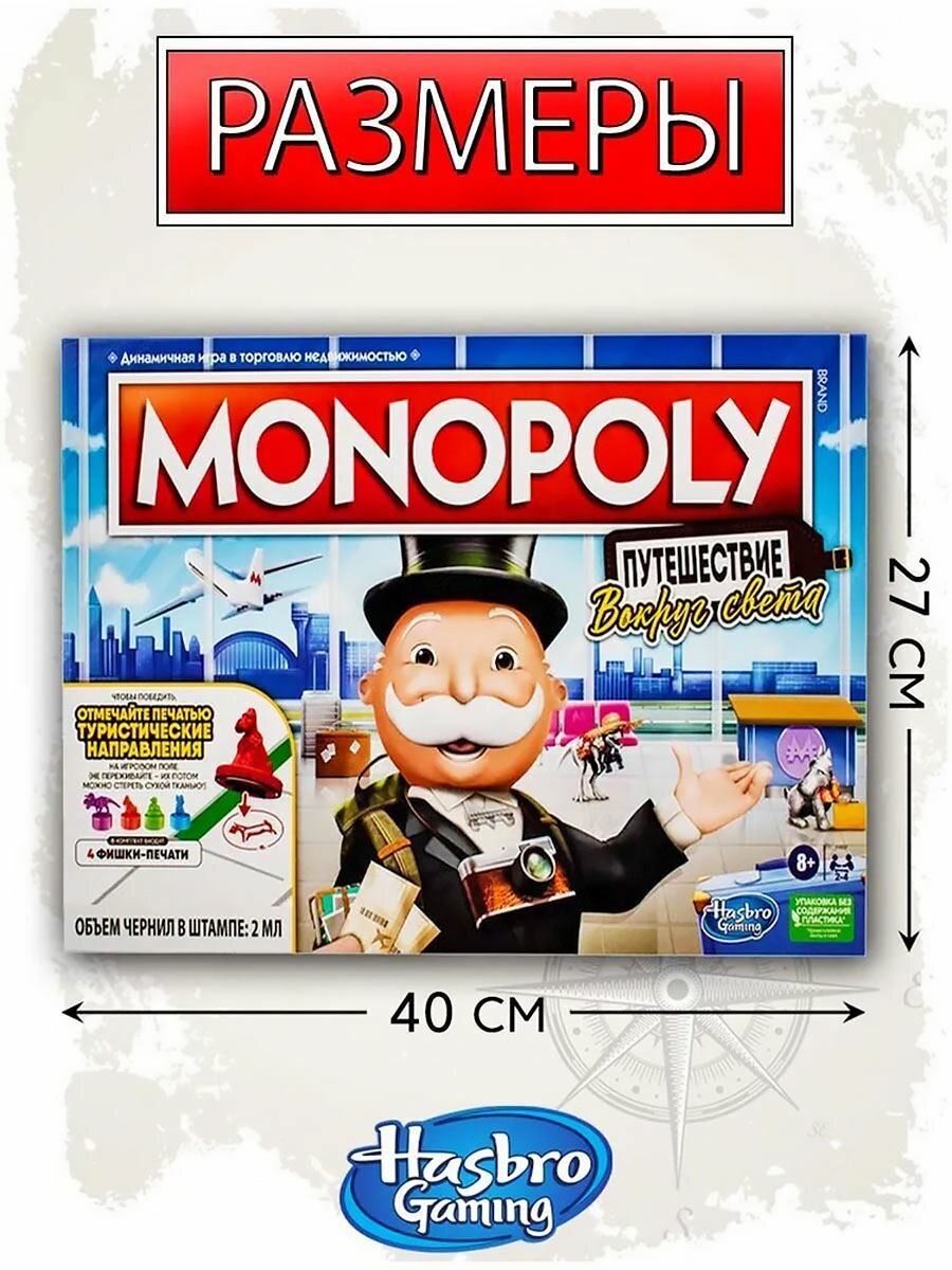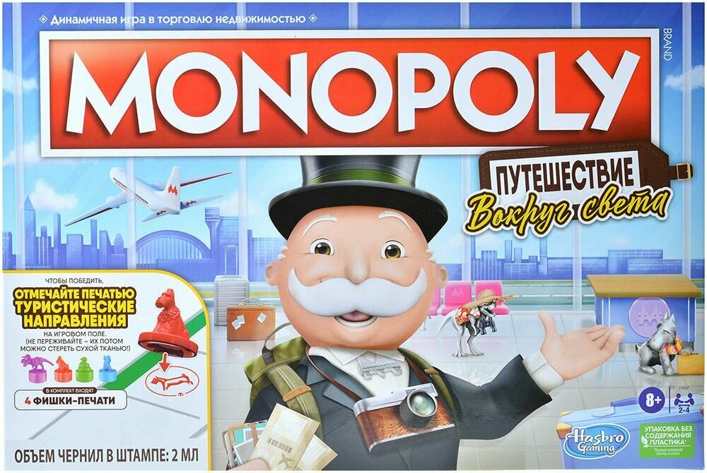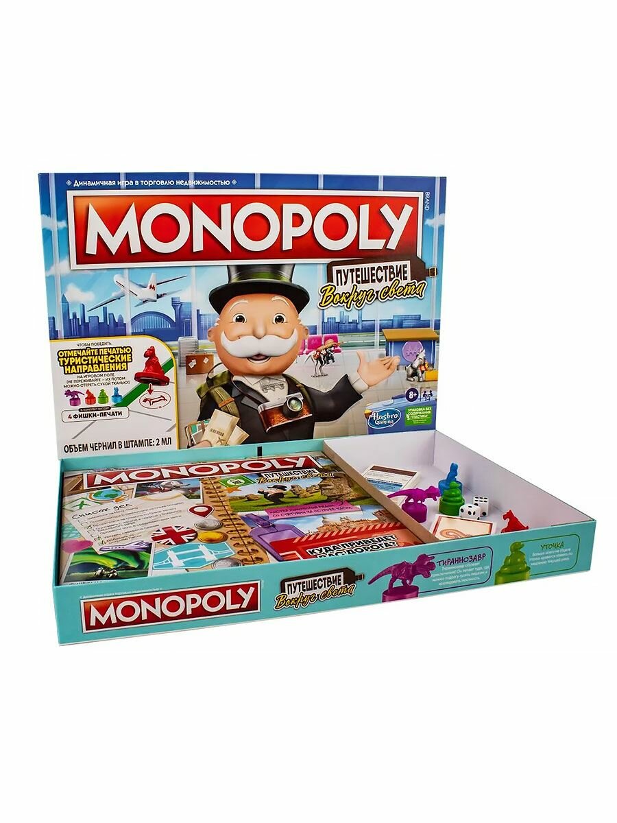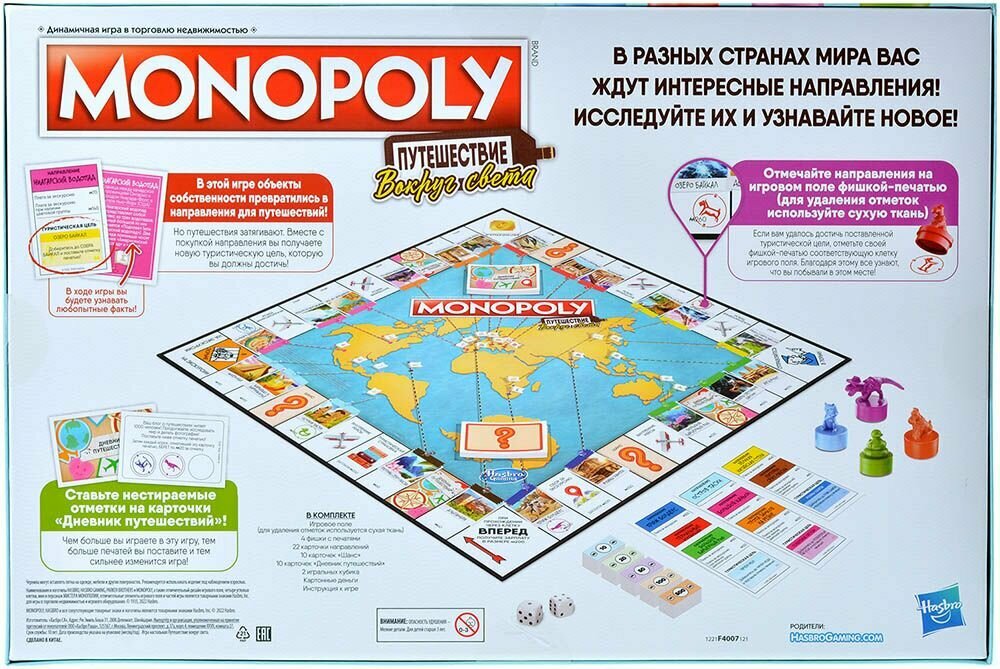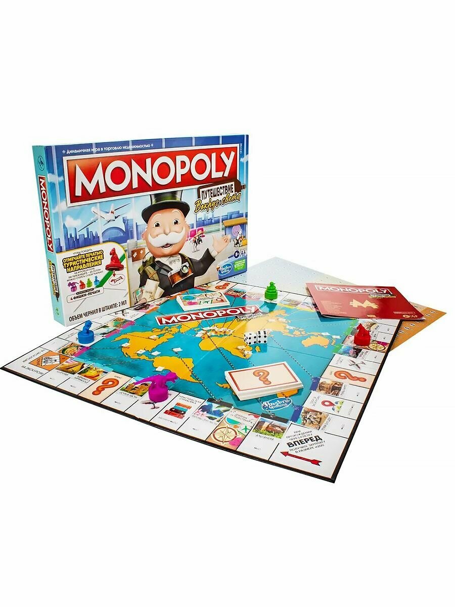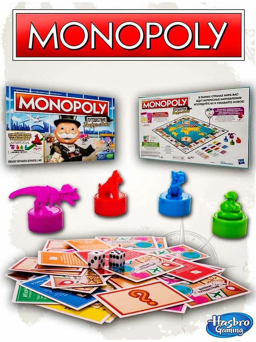Монополия — динамичная игра о торговле недвижимостью! Настольная игра «Монополия Путешествие вокруг света» — это поворот в классическом игровом процессе Монополии, в котором игроки открывают для себя и посещают захватывающие туристические направления. Во имя победы игроки покупают туристические места, достигают туристических целей и отмечают клетки направления своей фишкой-печатью ( для удаления отметок используется сухая ткань). Могут создавать воспоминания с помощью карточек «Дневник путешествий», которые, в последующих играх, станут частью игрового процесса, и узнавать интересные факты о местах по всему миру. Отличная игра для любителей путешествий! Это издание игры «Монополия», посвященное путешествиям, — веселая игра для семейного вечера и отличная игра для детей от 8 лет и старше.