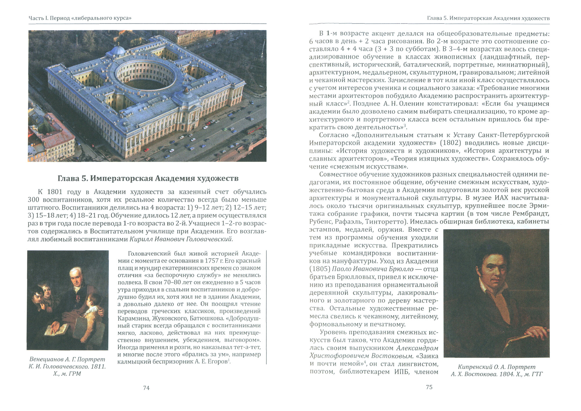 В книге доктора исторических наук О. Б. Островского прослеживается влияние на русскую художественную культуру основных исторических факторов эпохи на трех этапах правления Александра I: эстетических вкусов императора, императриц Марии Федоровны и Елизаветы Алексеевны, членов царской фамилии; системы народного образования; государственных учреждений культуры (Академия художеств, дирекция Императорских театров, Придворная певческая капелла, Эрмитаж, Комитет строений и гидравлических работ и др.); цензуры, книгоиздания и печати; литературно-художественных объединений, частных салонов и отдельных меценатов. Рассмотрено также влияние преходящих факторов эпохи: реформ "либерального курса", последствий Тильзитского мира, Отечественной войны 1812 года, аракчеевщины, движения декабристов. В работе использовано большое количество исторических и искусствоведческих научных публикаций, мемуарной литературы, прессы 1801-1825 годов, опубликованных и архивных источников, многие из которых впервые вводятся в научный оборот.