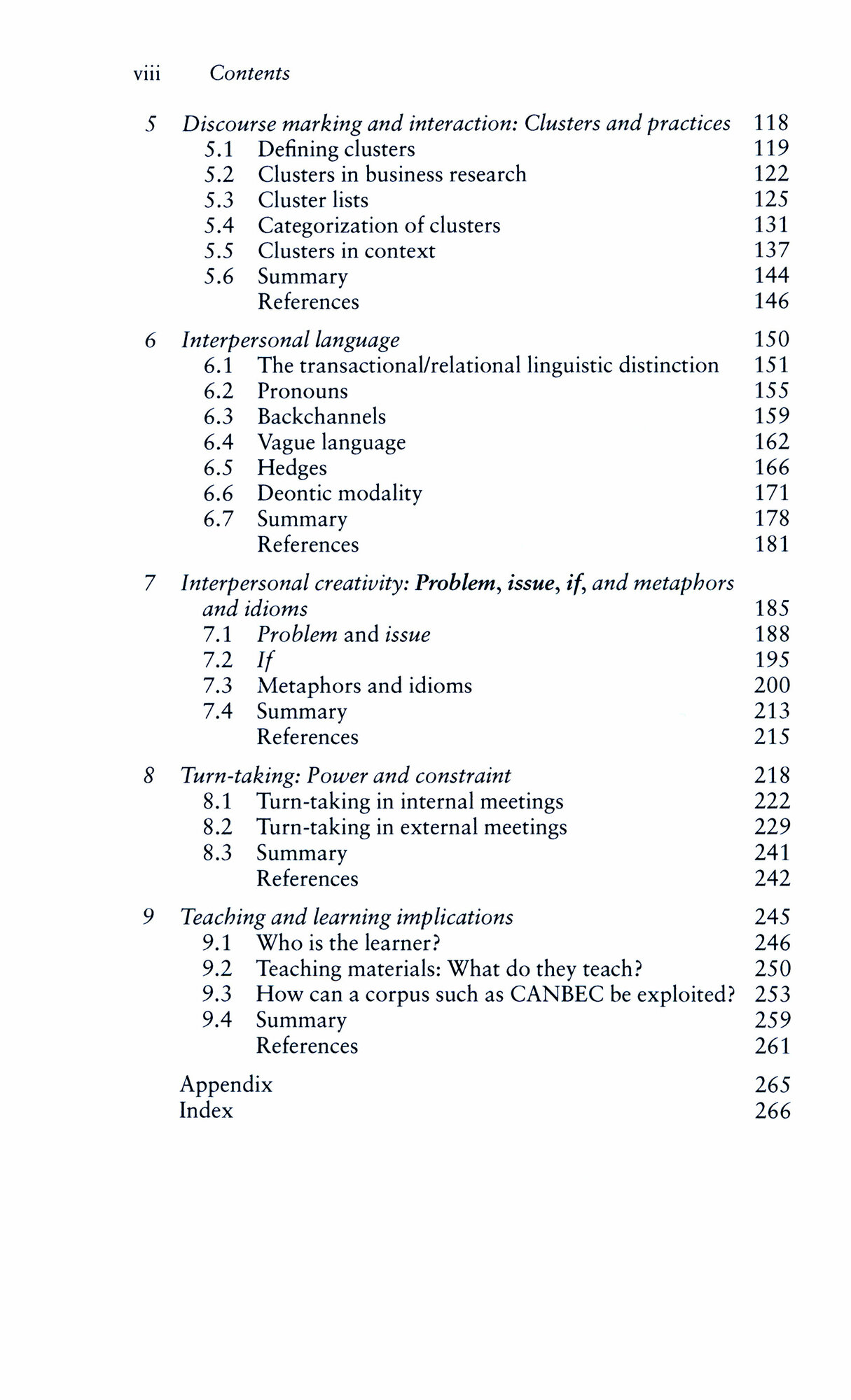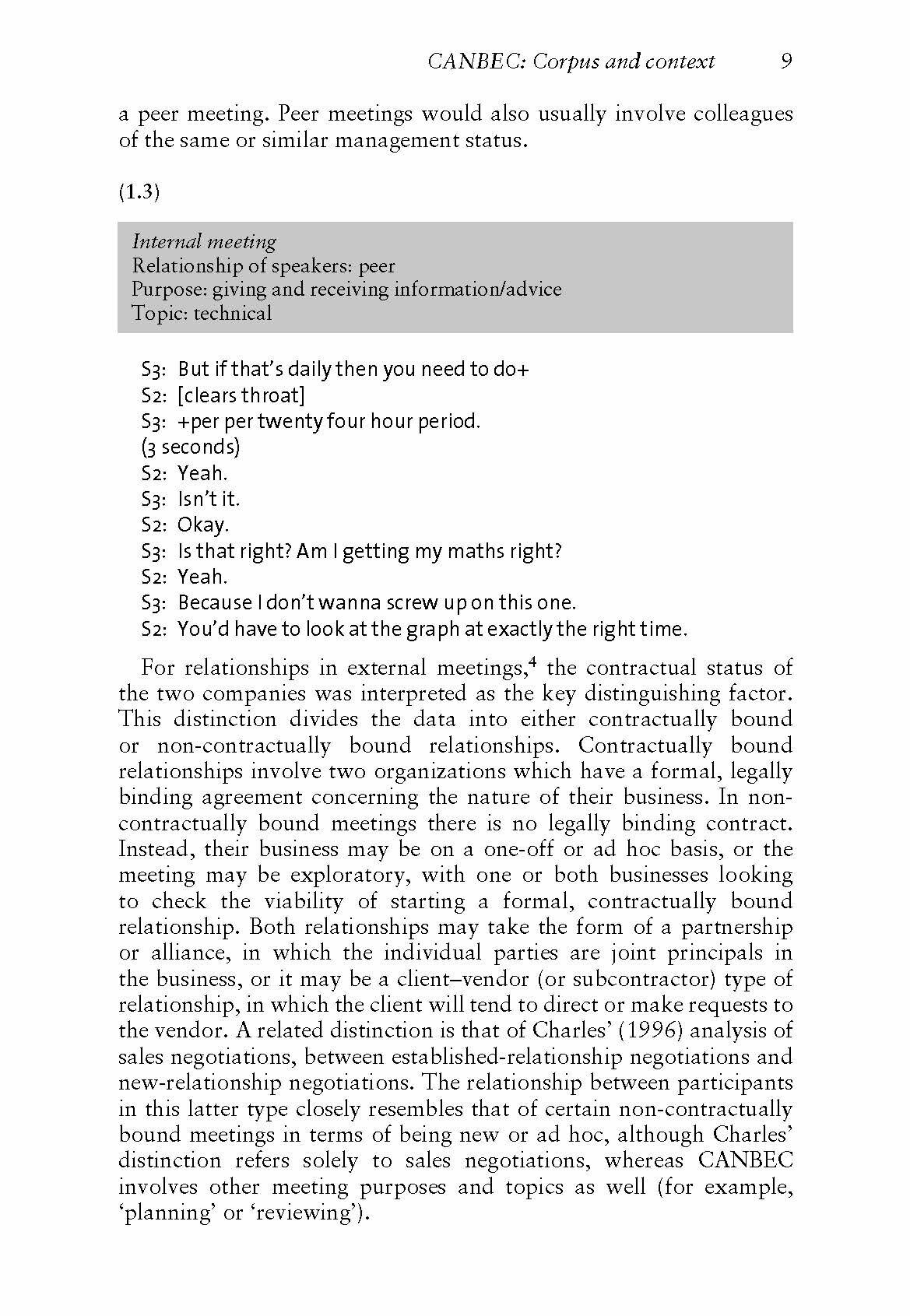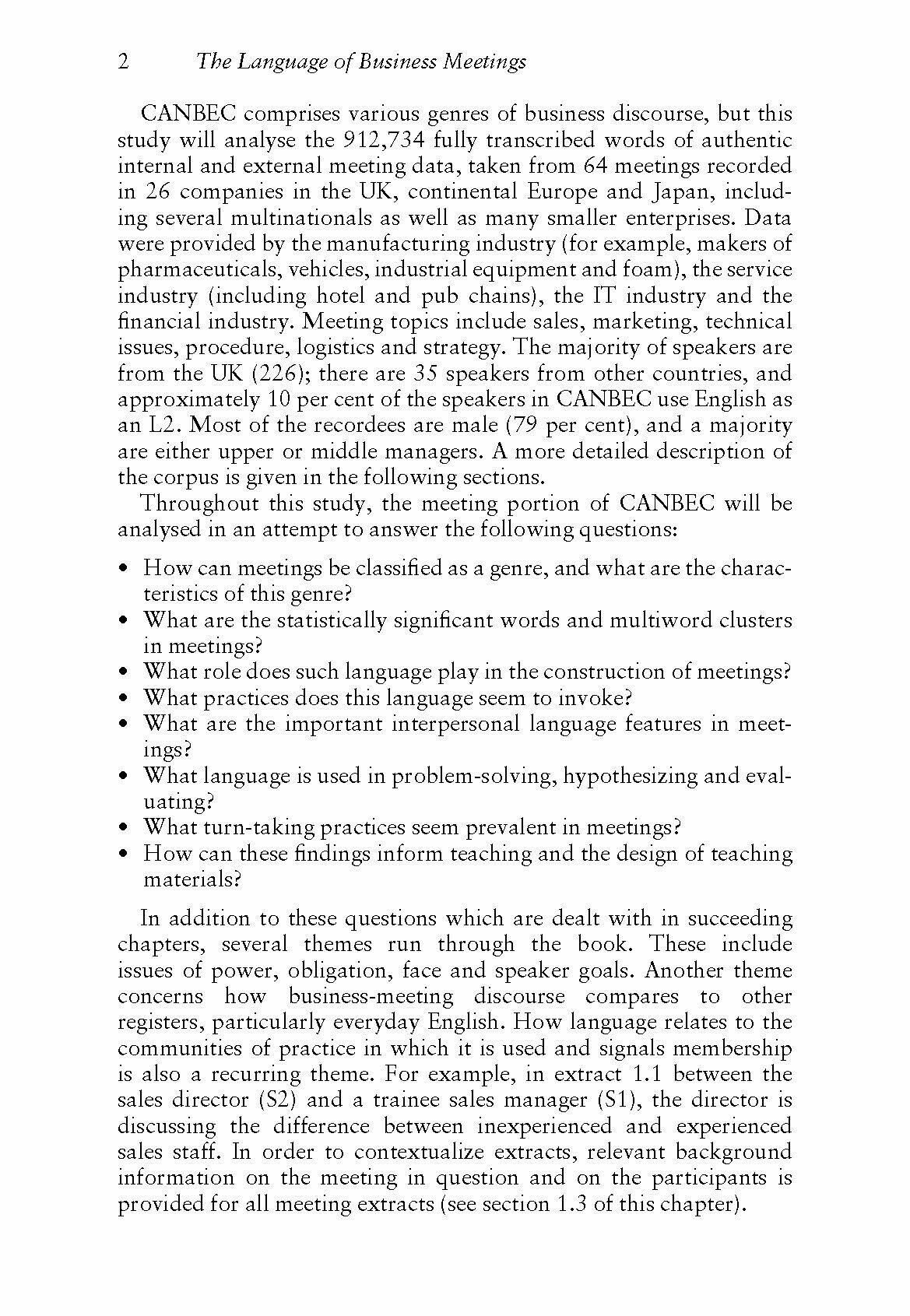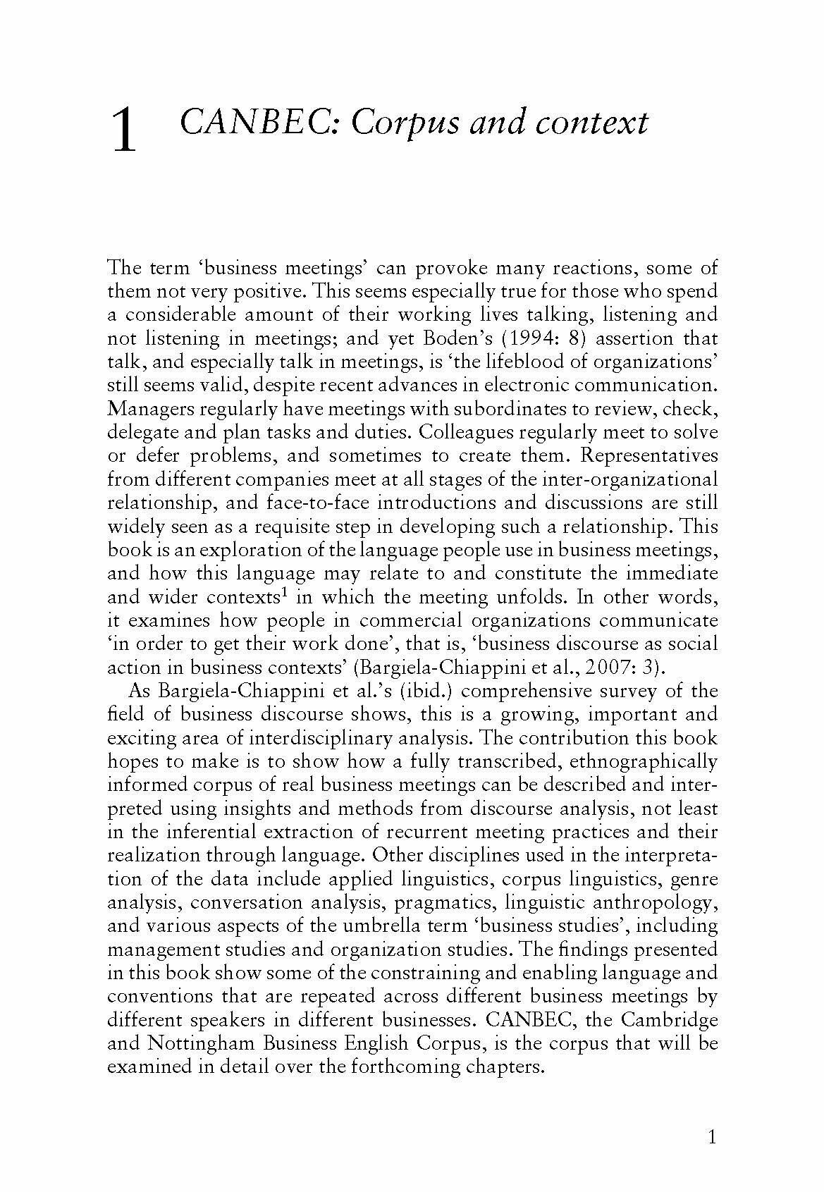 The content of the book is taken from unique research based on a unique corpus of business meetings -the Cambridge and Nottingham Spoken Business English Corpus (CANBEC).