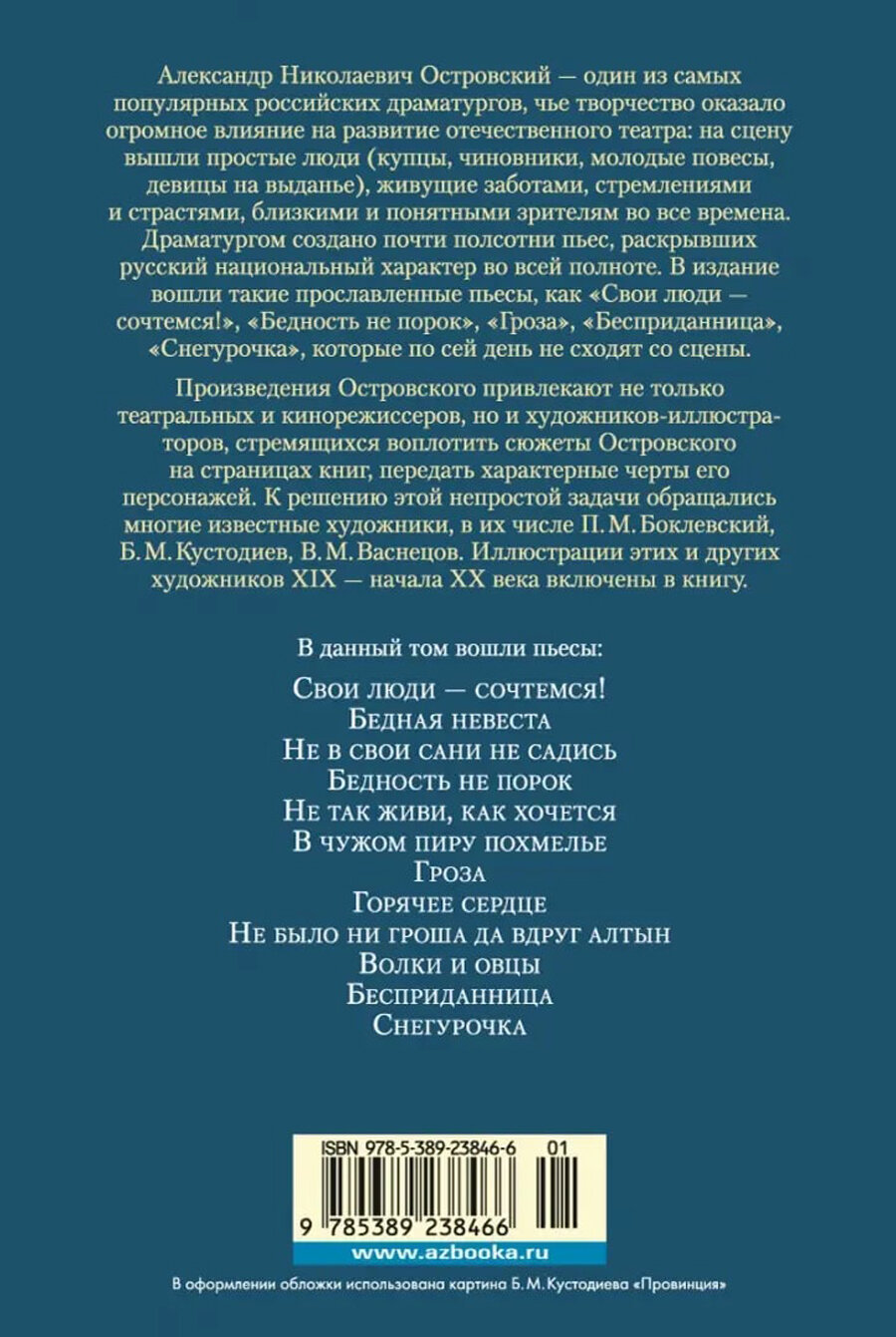 Александр Николаевич Островский — один из самых популярных российских драматургов, чье творчество оказало огромное влияние на развитие отечественного театра: на сцену вышли простые люди (купцы, чиновники, молодые повесы, девицы на выданье), живущие заботами, стремлениями и страстями, близкими и понятными зрителям во все времена. Драматургом создано почти полсотни пьес, раскрывших русский национальный характер во всей полноте. В издание вошли такие прославленные пьесы, как «Свои люди — сочтемся!», «Бедность не порок», «Гроза», «Бесприданница», «Снегурочка», которые по сей день не сходят со сцены. Произведения Островского привлекают не только театральных и кинорежиссеров, но и художников-иллюстраторов, стремящихся воплотить сюжеты Островского на страницах книг, передать характерные черты его персонажей. К решению этой непростой задачи обращались многие известные художники, в их числе П. М. Боклевский, Б. М. Кустодиев, В. М. Васнецов. Иллюстрации этих и других художников XIX — начала ХХ века включены в книгу.