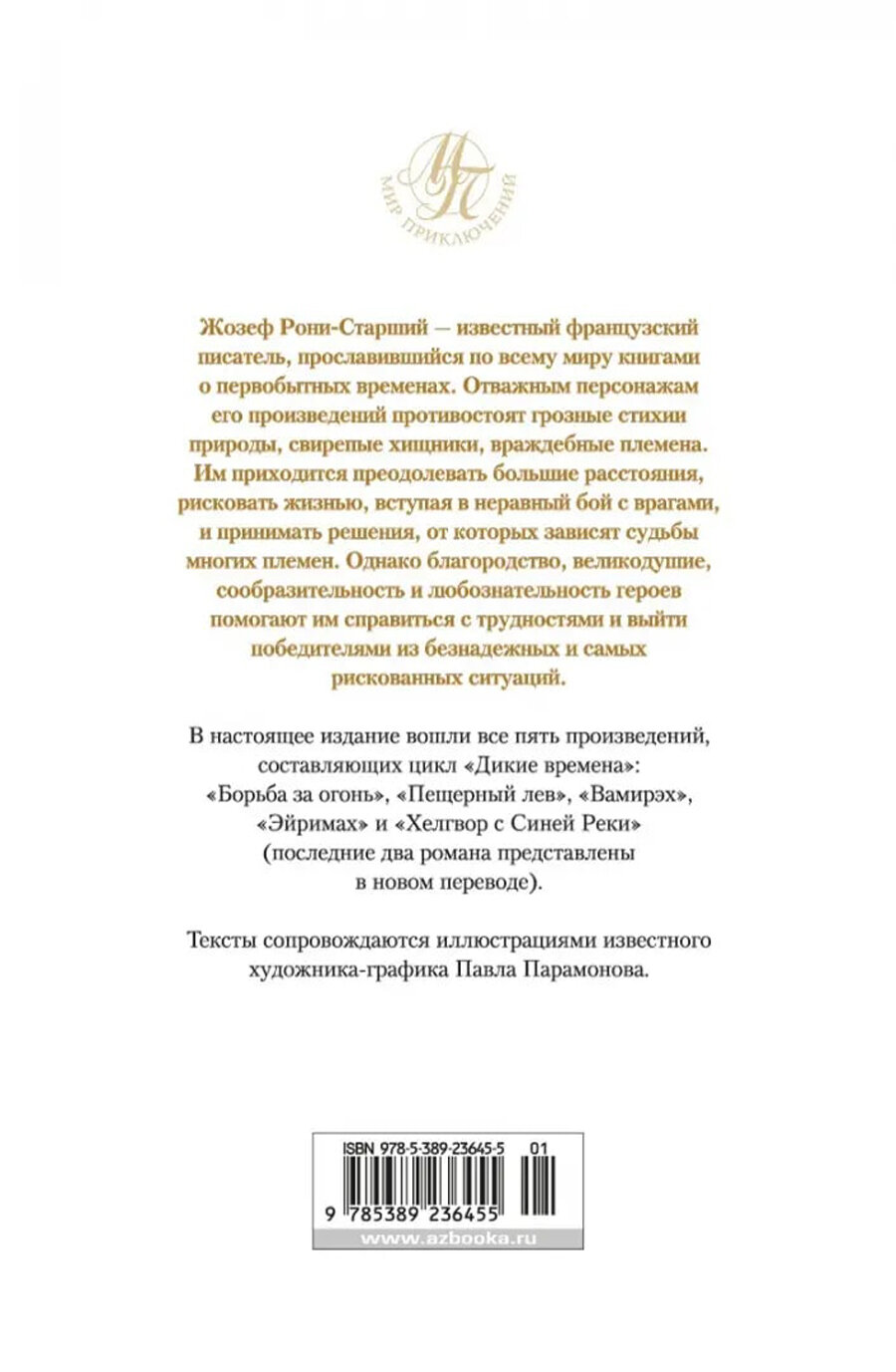 Жозеф Рони-Старший — известный французский писатель, прославившийся по всему миру книгами о первобытных временах. Отважным персонажам его произведений противостоят грозные стихии природы, свирепые хищники, враждебные племена. Им приходится преодолевать большие расстояния, рисковать жизнью, вступая в неравный бой с врагами, и принимать решения, от которых зависят судьбы многих племен. Однако благородство, великодушие, сообразительность и любознательность героев помогают им справиться с трудностями и выйти победителями из безнадежных и самых рискованных ситуаций. В настоящее издание вошли пять произведений, составляющих цикл «Дикие времена»: «Борьба за огонь», «Пещерный лев», «Вамирэх», «Эйримах» и «Хелгвор с Синей Реки» (последние два романа представлены в новом переводе). Тексты сопровождаются иллюстрациями известного художника-графика Павла Парамонова.